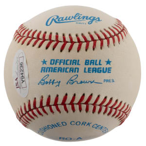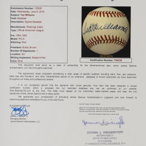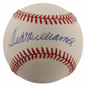 Make an essential addition to your autograph collection, with the capture of this Ted Williams single-signed baseball. One of the game’s true elites, Williams is an absolute must for dedicated signature seekers. “Teddy Ballgame” performed admirably in locating a firm example of his prized signature on the sweet spot of the offered OAL/Brown baseball, which reports as clean and bright.