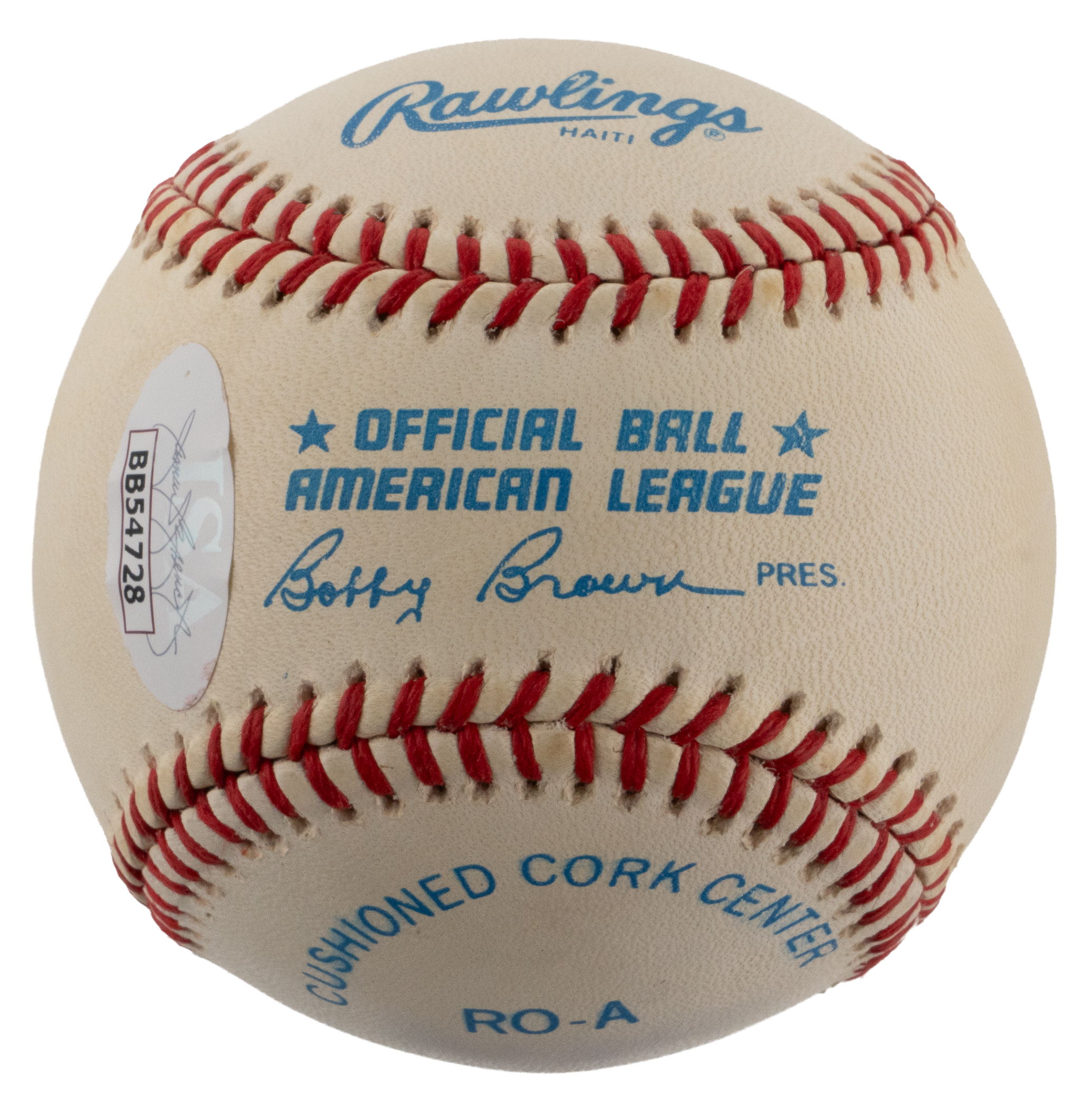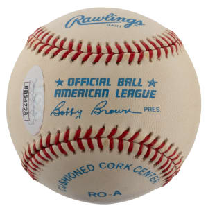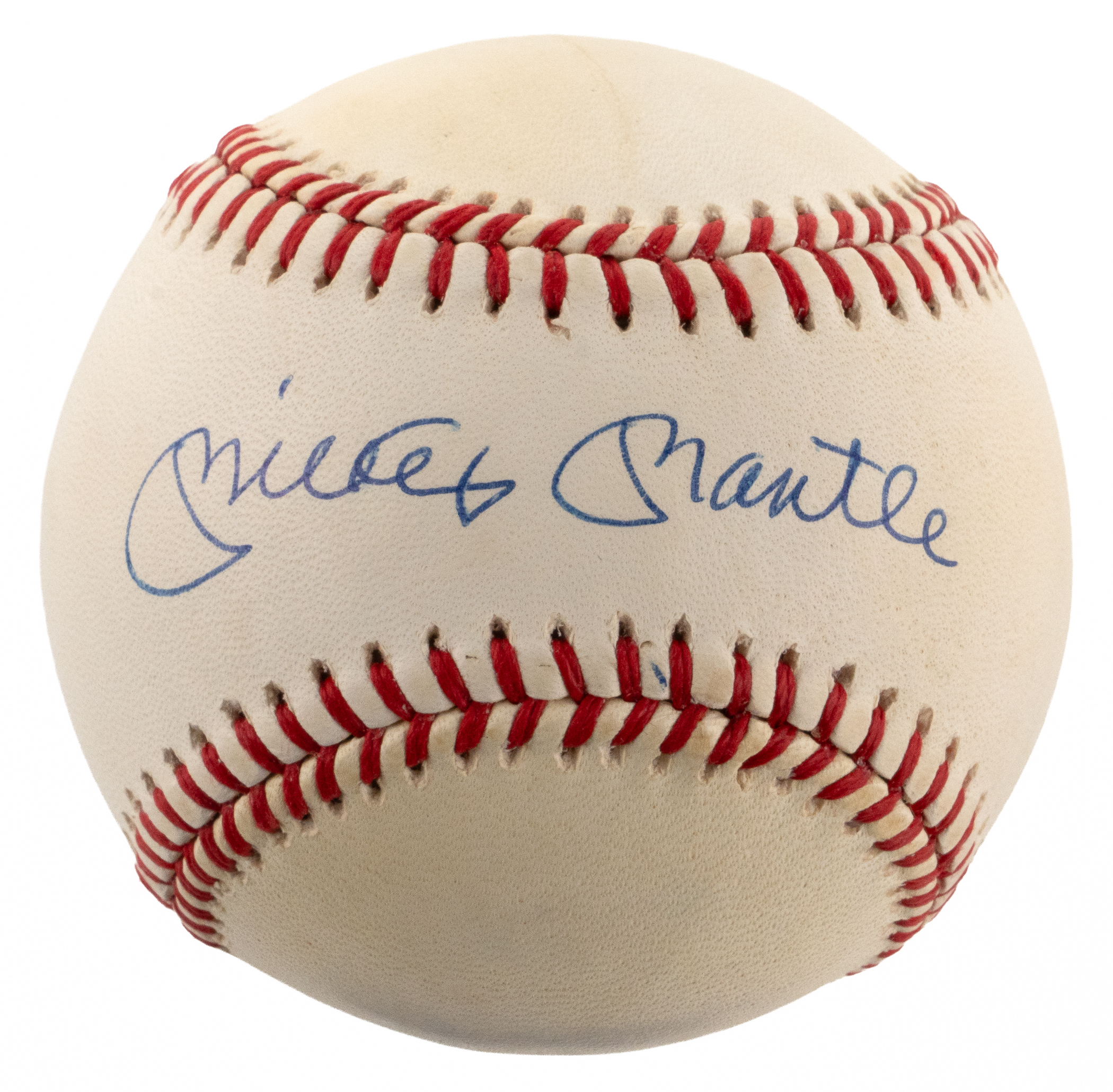 Legendary slugger Mickey Mantle knocked it out of the park when he signed this lightly toned OAL/Brown baseball. Applied to the preferred sweet spot location, this firm signature projects great potency, and the ball's factory labeling stamps remain bold.