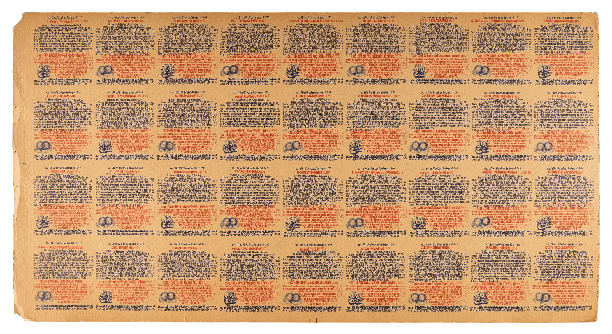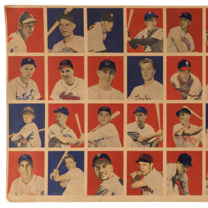 Presented is a 1949 Bowman First Series uncut sheet. During the production process backs were overprinted and discarded as factory scraps. This surviving 36-card sheet is comprised of (4) 9-card rows. Despite varying levels of perimeter and interior creasing affecting several cards, this artifact still exhibits outstanding eye appeal. Highlights include: #1 Bickford RC (creased), #11 Boudreau RC (crease-free), #23 Doerr (crease-free), #24 Musial (crease-free), #26 Kell RC (crease-free), #27 Feller (creased), #29 Kiner (creased), #33 Spahn (crease-free), #35 Raschi RC (crease-free) and #36 Reese (creased). The size/weight of this item requires that there will be an additional shipping charge for this lot.