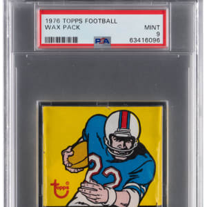 Graded MINT 9 by PSA. Find "sweetness" with the offered 1976 Topps Football unopened wax pack! High-end legends including E. Jones RC, Lambert RC and Payton RC along with numerous Hall of Famers are among the possibilities tucked within. Ranks in the upper 15% of all similar packs judged by the authenticator.