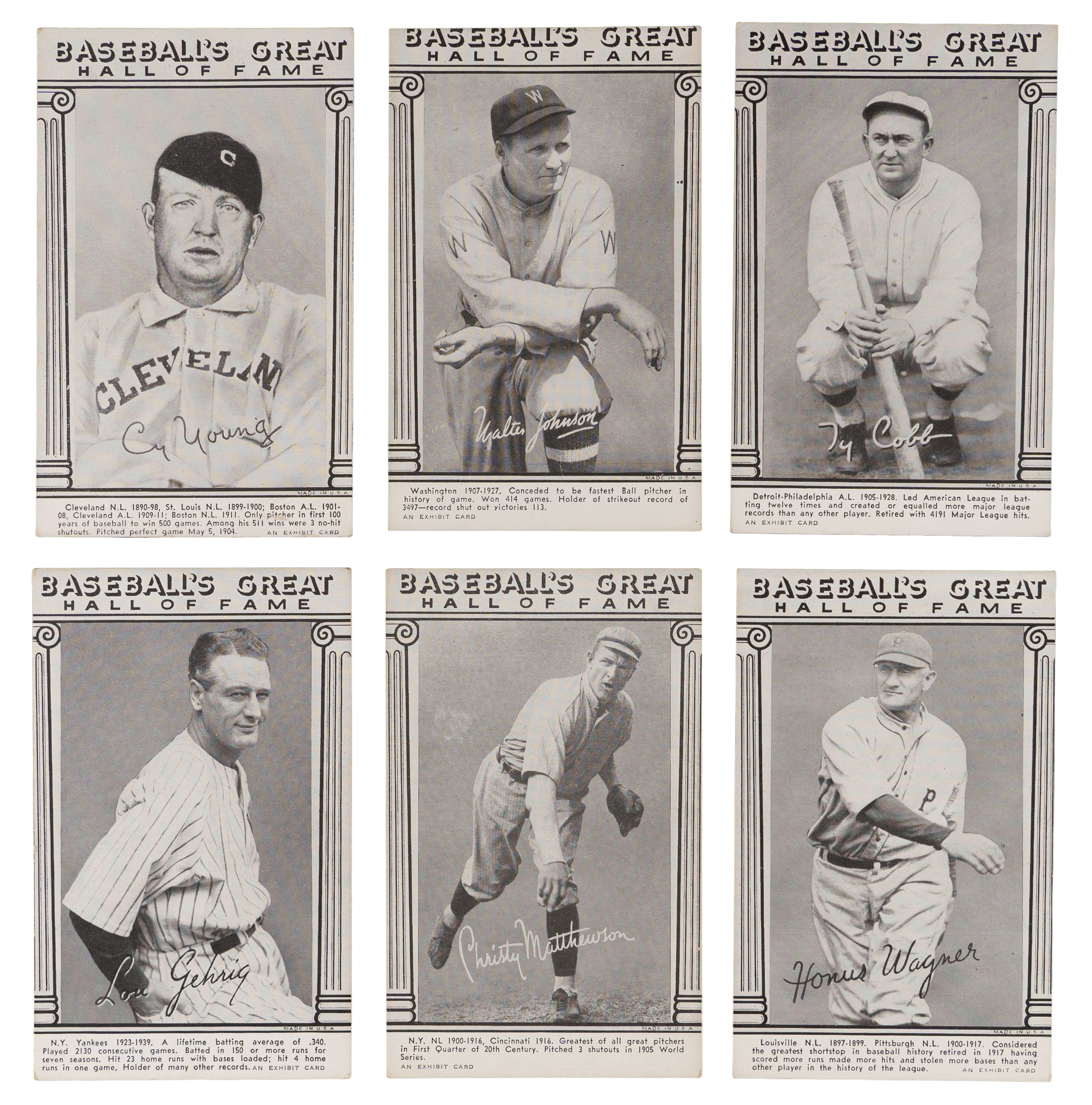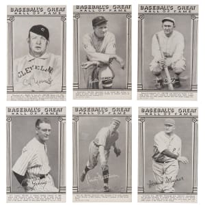 Those legends who found their way into Cooperstown by 1948 are celebrated with the offered Baseball’s Great Hall of Fame Exhibits near complete of (31/33) cards. This mid-grade edition averages (VG to VG-EX) condition with nearly 10% displaying reverse writing. Keys include: Cobb (VG-EX), Gehrig (VG), W. Johnson (VG), Mathewson (VG-EX), Wagner (EX) and C. Young (VG). Missing only both Ruth poses for completion.