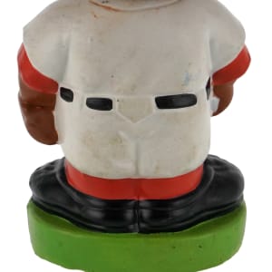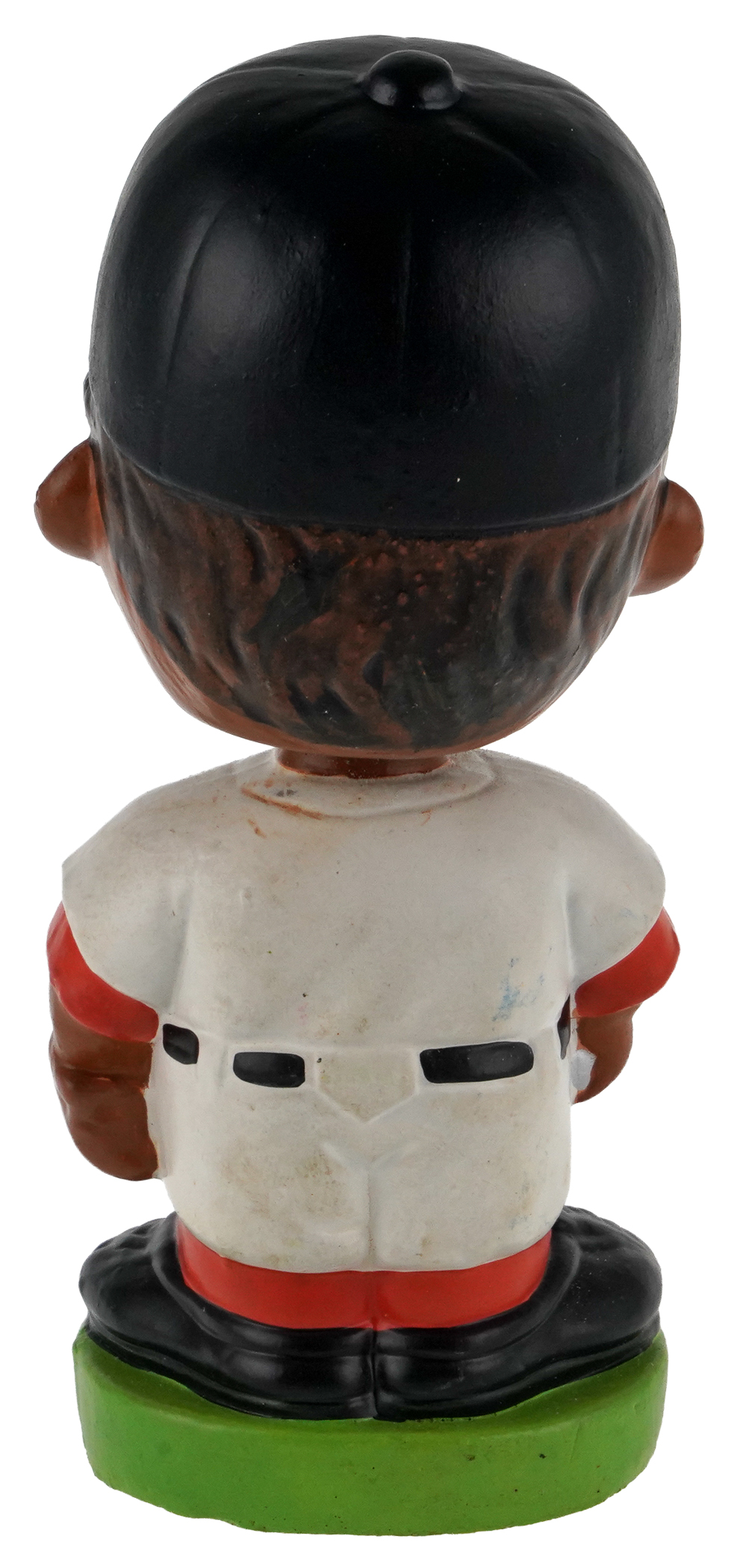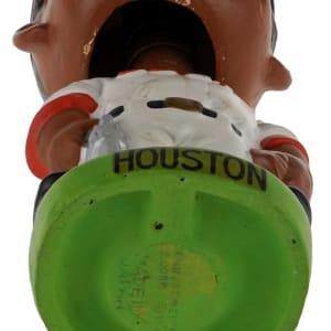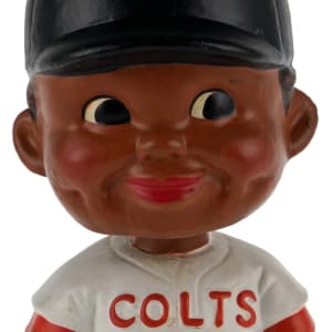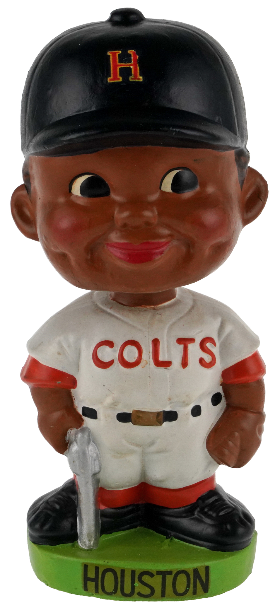 Be quick on the draw for this rare 1962 Houston Colts .45s black player bobblehead. Representing a golden opportunity for advanced collectors, this piece is considered one of the rarest of all bobblehead figures. One of two Colt .45s varieties from the 1960s black player series, this one is known as the “happy face” version. An SS Corp. factory stamp under the base is copyright dated 1962. Raised letters span the jersey front, and decals are positioned on the cap and the front of the green round base. This pistol toting hombre radiates display appeal, despite a barely perceptible 1” hairline crack extending from the right check to the head opening. Typically, the head openings of bobbleheads show the strongest signs of attrition, but in this case, wear around the opening is relatively minor. There also appears to be some minor paint touch up around the H decal on the cap. Otherwise this is a splendid example of an elusive bobblehead type, presenting Ex-Mt+ details, with deference to the fairly unobtrusive conditions described above.