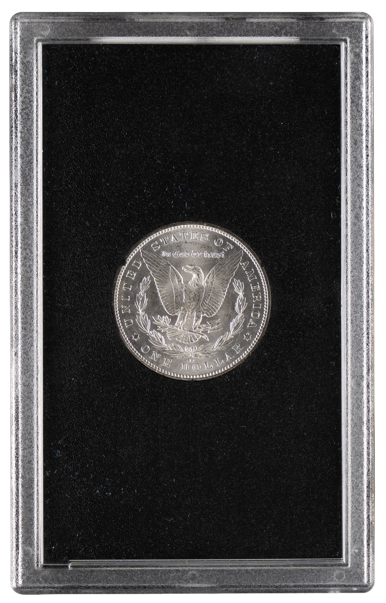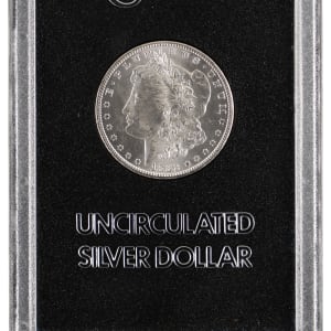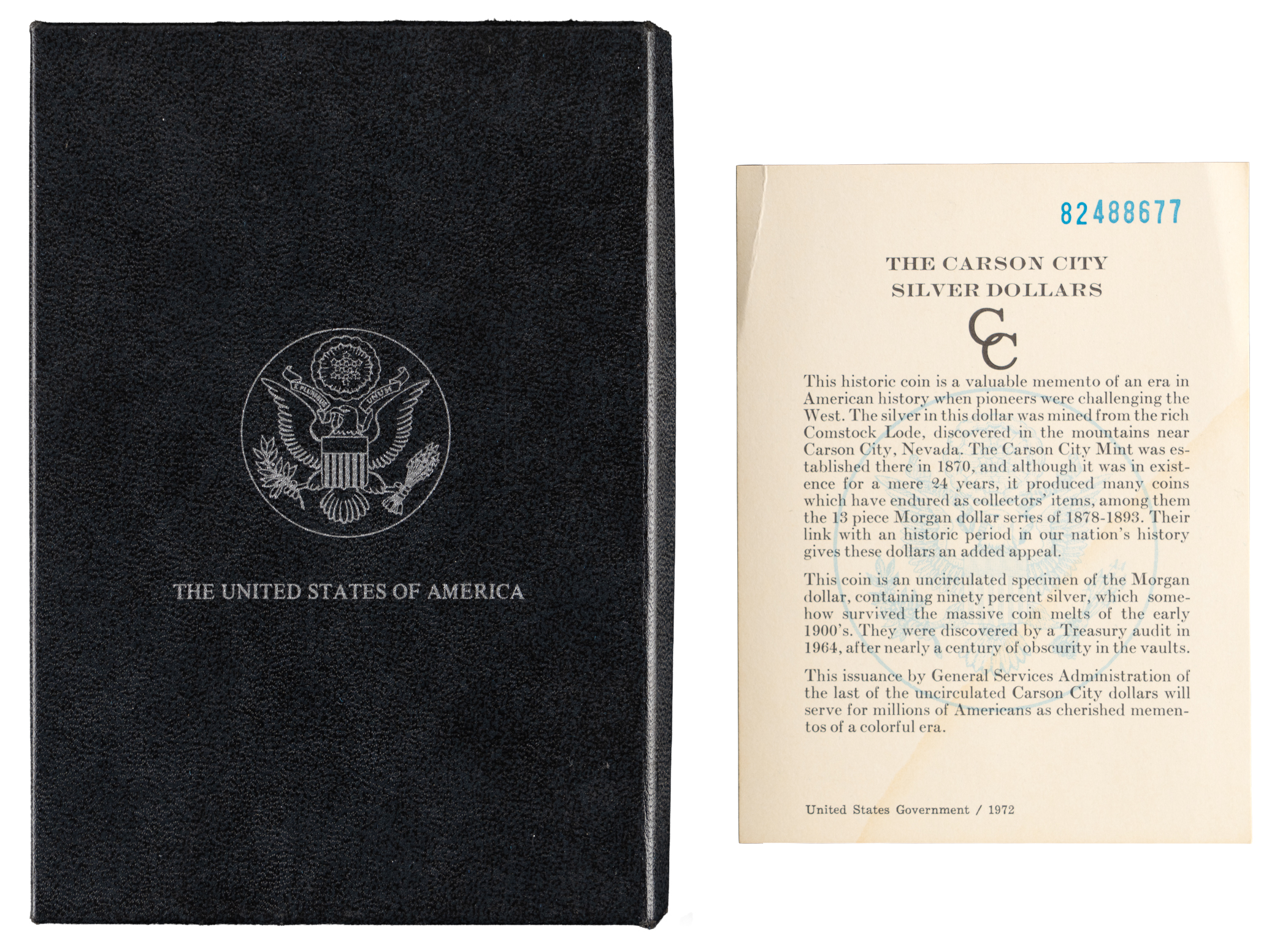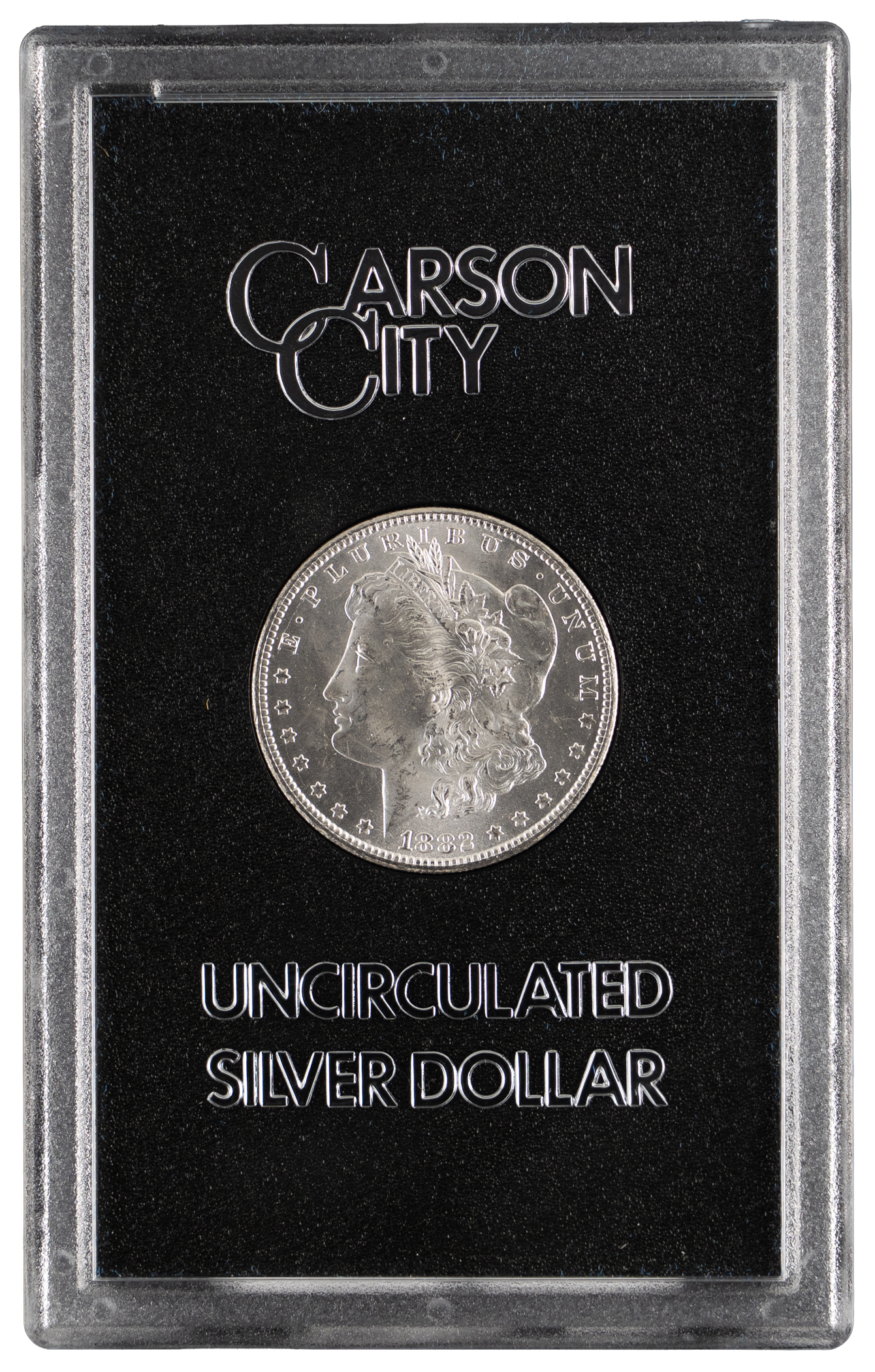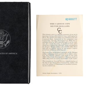 Old West nostalgia beckons with this 1882-CC GSA Morgan silver dollar. Located in Nevada, the famed Carson City Mint was founded to handle silver coming in from the Comstock Lode. Morgan silver dollars were only struck at the Carson City Mint in thirteen different years over the period 1878-1893, and the quantities produced were relatively small. Housed in a GSA holder, this gorgeous coin reports in brilliant uncirculated state. Accompanying are its original black box, and a 1972 United States Government COA stating this coin was produced from silver that came from the Comstock Lode, making this coin an historic treasure.