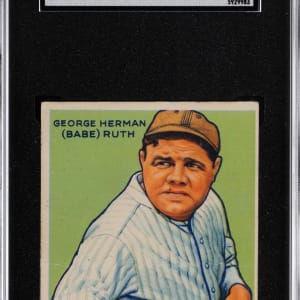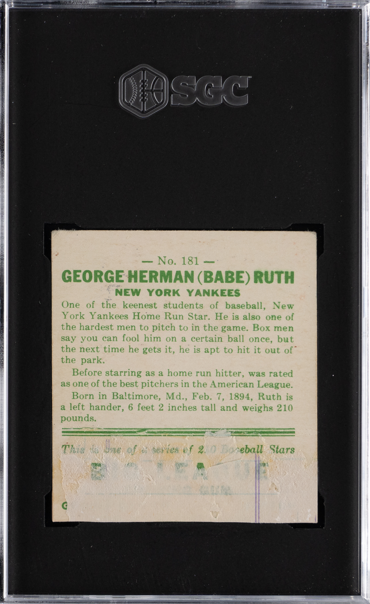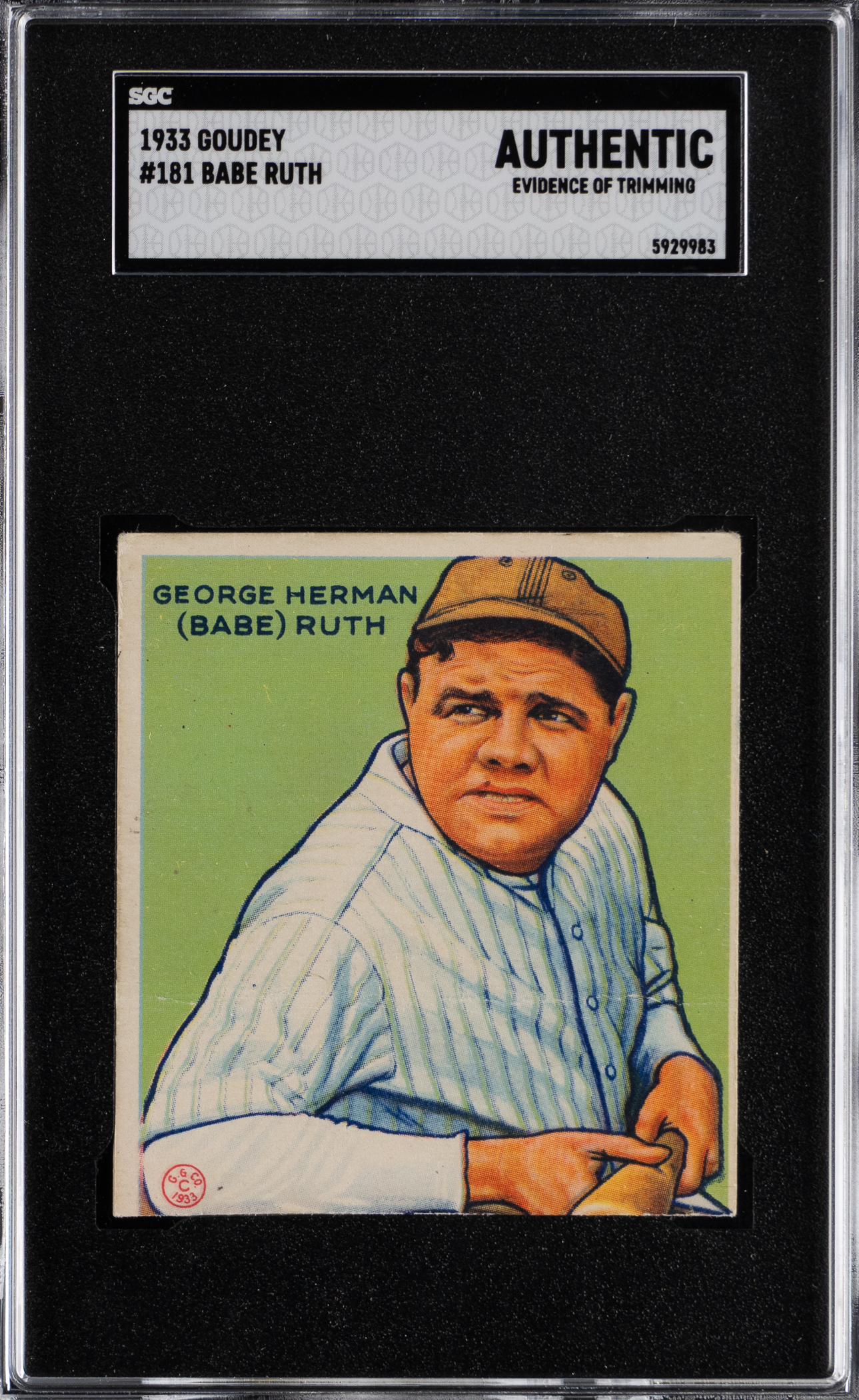 Graded AUTHENTIC by SGC due to the "Big League Chewing Gum" section being trimmed and reverse paper residue. The offered 1933 Goudey #181 Babe Ruth was undoubtedly a cherished prize of a previous owner. Despite a combination of obvious wear including horizontal creasing, this pre-war classic still showcases rich surface colors and intricately detailed uniform accents of the New York Yankees Hall of Fame slugger's illustration.