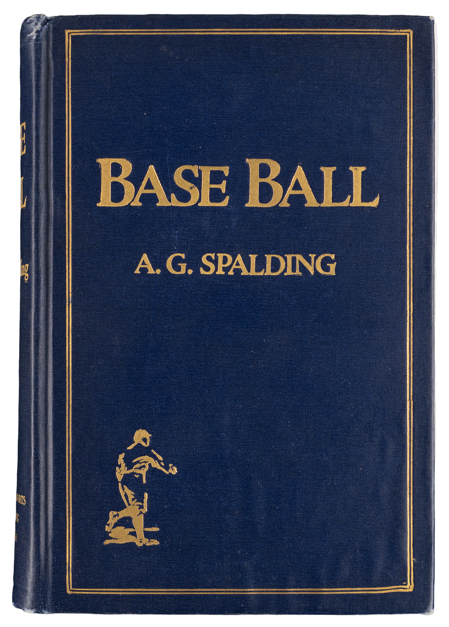 Rare presentation edition of America's National Game by A. G. Spalding. Originally published by American Sports Publishing Company, New York, 1911. The offered example features the rarer "Base Ball" cover binding variant as well as trademark inscriptions to the recipient on the interior. This particular example was presented to Fred Woodcock, who appeared in a handful of games for the 1892 Pittsburgh Pirates before embarking on a decades-long business career in Boston. At the bottom of the presentation page is a notation about a 1916 dinner commemorating the 40th anniversary of the National League, suggesting these special editions were given to dignitaries gathered at this event. This profusely illustrated book is considered one of the great classics of baseball literature because it was the most ambitious history of the game ever published up to that time and, most important, it incorporates the findings of the Mills Report of 1907. That report credited Abner Doubleday (albeit, most scholars today agree, erroneously) with having invented the game of baseball in 1839. With the publication of this book, that myth became firmly entrenched within the collective consciousness of American culture and persists to this day, despite its refutation in more modern times by numerous historians. A. G. Spalding was perhaps the most influential figure in baseball history, having been a former star pitcher, team owner, and sporting-goods magnate. He passed away in 1915 and was elected to the Hall of Fame in 1939. The 542-page hardcover book (5.5 x 8 inches) is complete with all of its fold-out illustrations. The book displays light wear to the dark blue boards as well as two small pencil notations present on the interior front page. In Excellent condition overall.