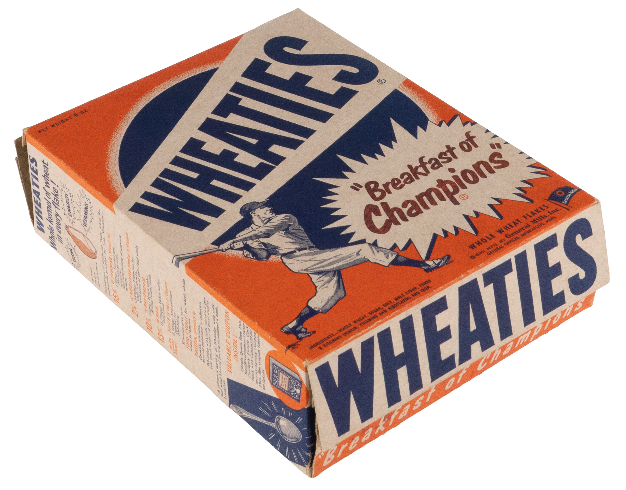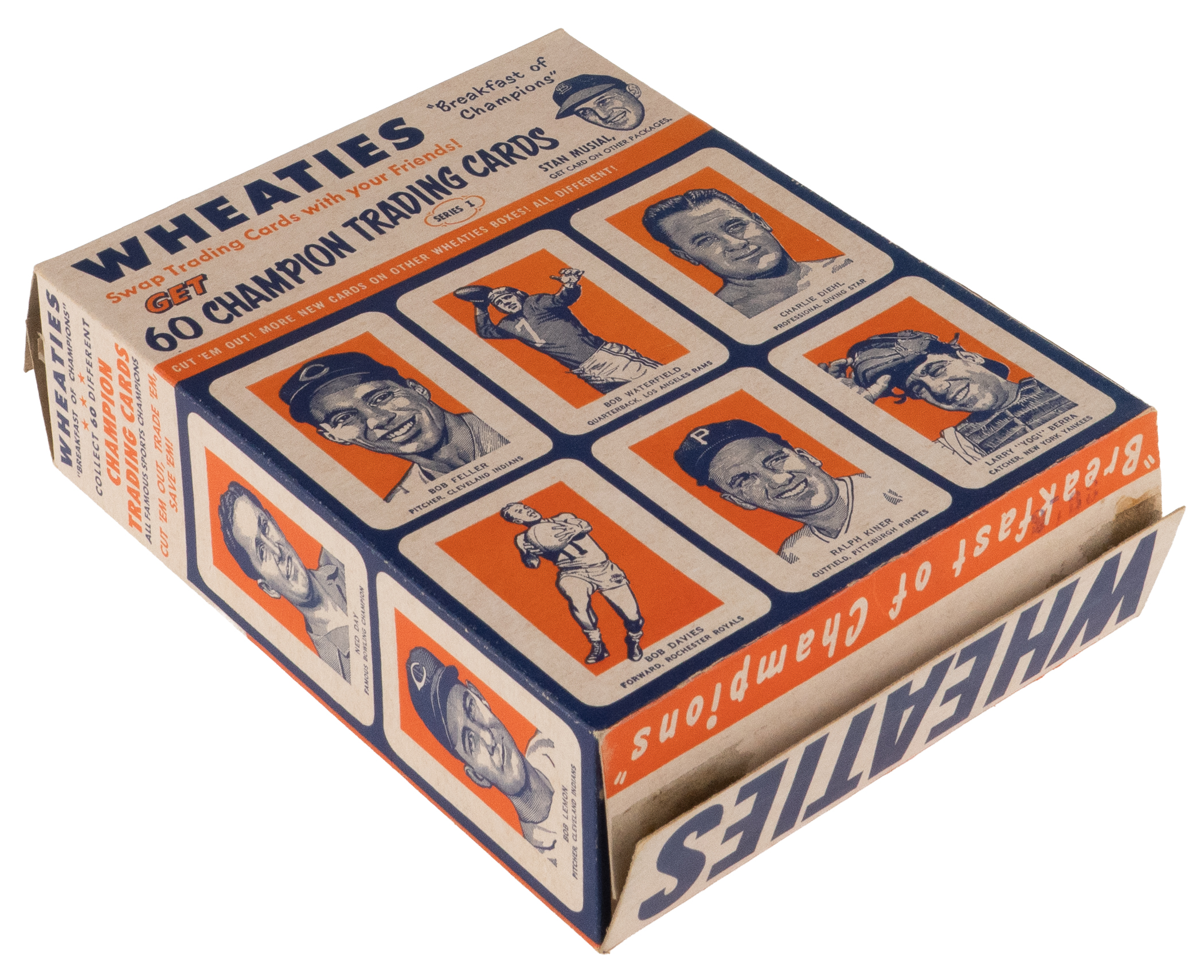 Exceptional 1952 Wheaties complete box featuring eight cards of acclaimed professional athletes on both the box bottom and right side panel. This "Breakfast of Champions" 8 oz. cereal container has withstood the past 74 years in superb condition with neatly separated top/bottom flaps and fully intact panels. Despite limited creasing impacting two cards, the overall presentation of the Series 1 trading card portion crowned by St. Louis Cardinals Hall of Famer Stan Musial is vibrant and attractive. Unless noted, each player is crease-free: Box Bottom: (6 cards) with Feller, Waterfield (creased), Diehl, Davies, Kiner (creased), Berra; Right Side Panel: Day and Lemon.