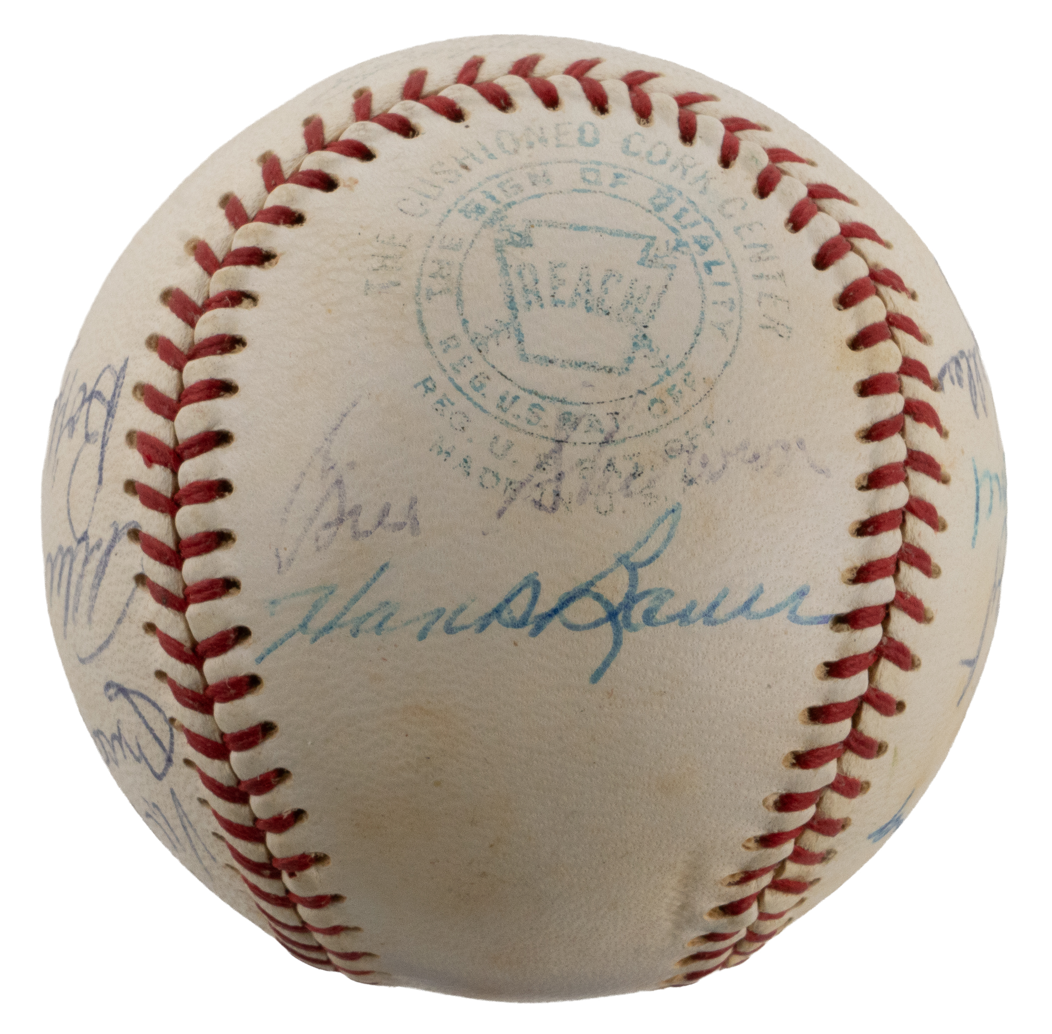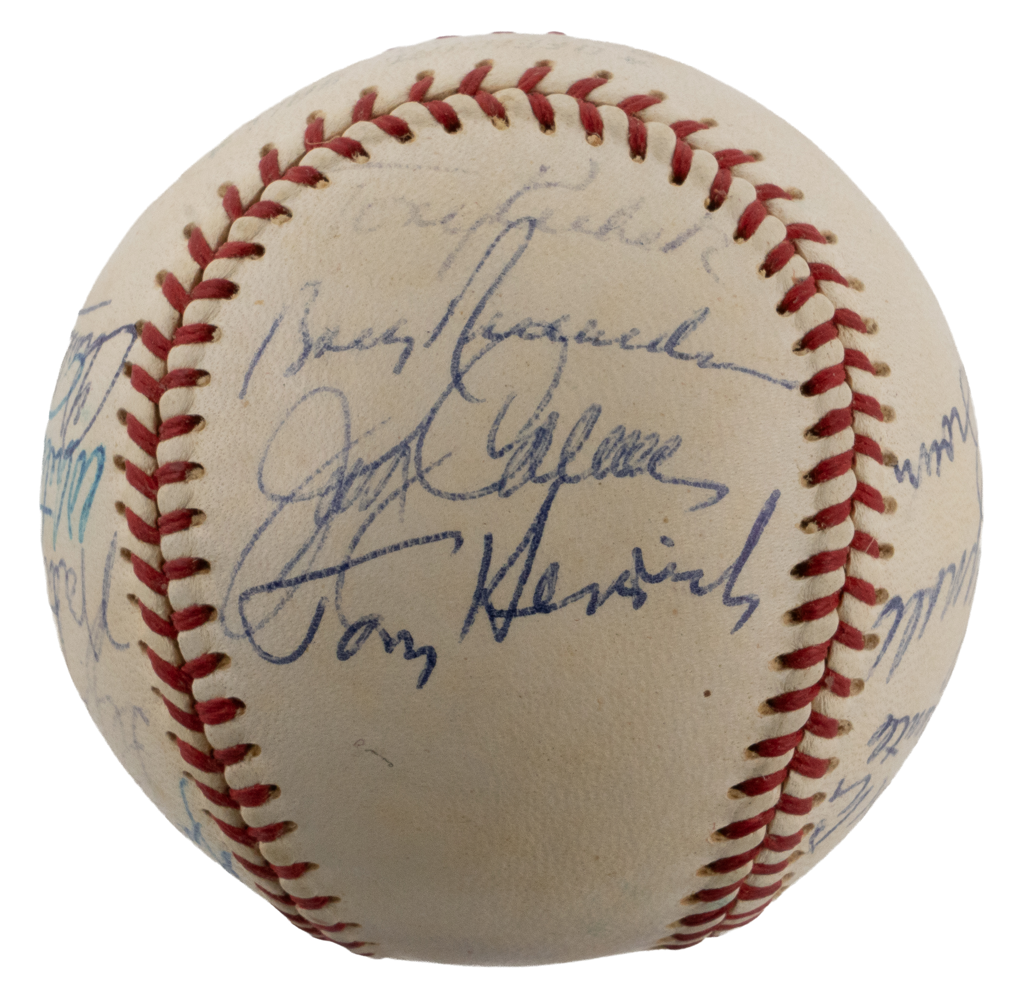 Pinstriped participants from several New York Yankees World Series title teams have penned the offered OAL/Cronin ball with (15) total autographs. The mostly "7-8" blue ink signatures are directly placed on the side panels of the moderately toned sphere. Includes: West Panel: Kubek, Richardson, J. Coleman, Henrich; East Panel: Skowron, Bauer; North Panel: Raschi, Mantle, Reynolds, B. Brown; South Panel: McDougald, Gomez, Hoyt, Ford and Keller. Auction LOA from James Spence/JSA.