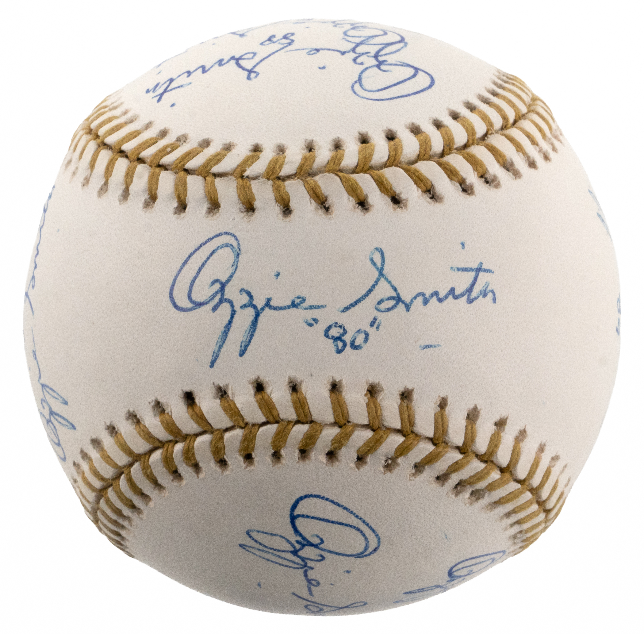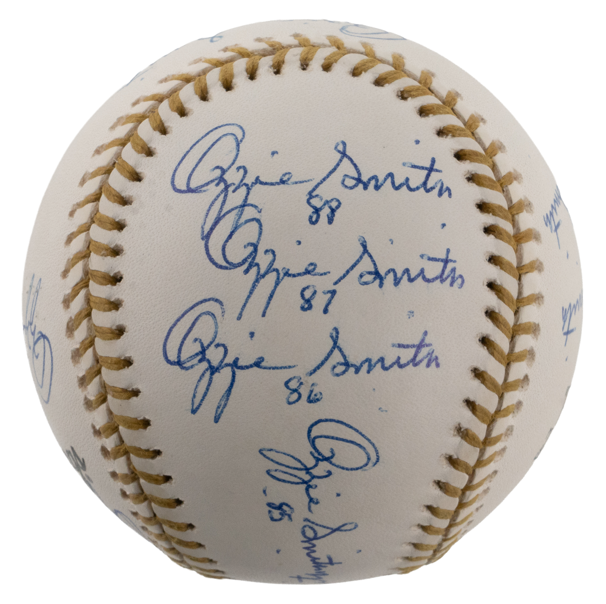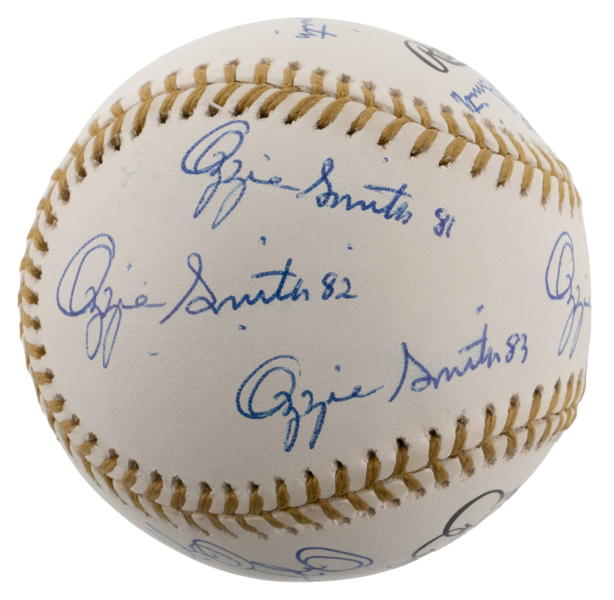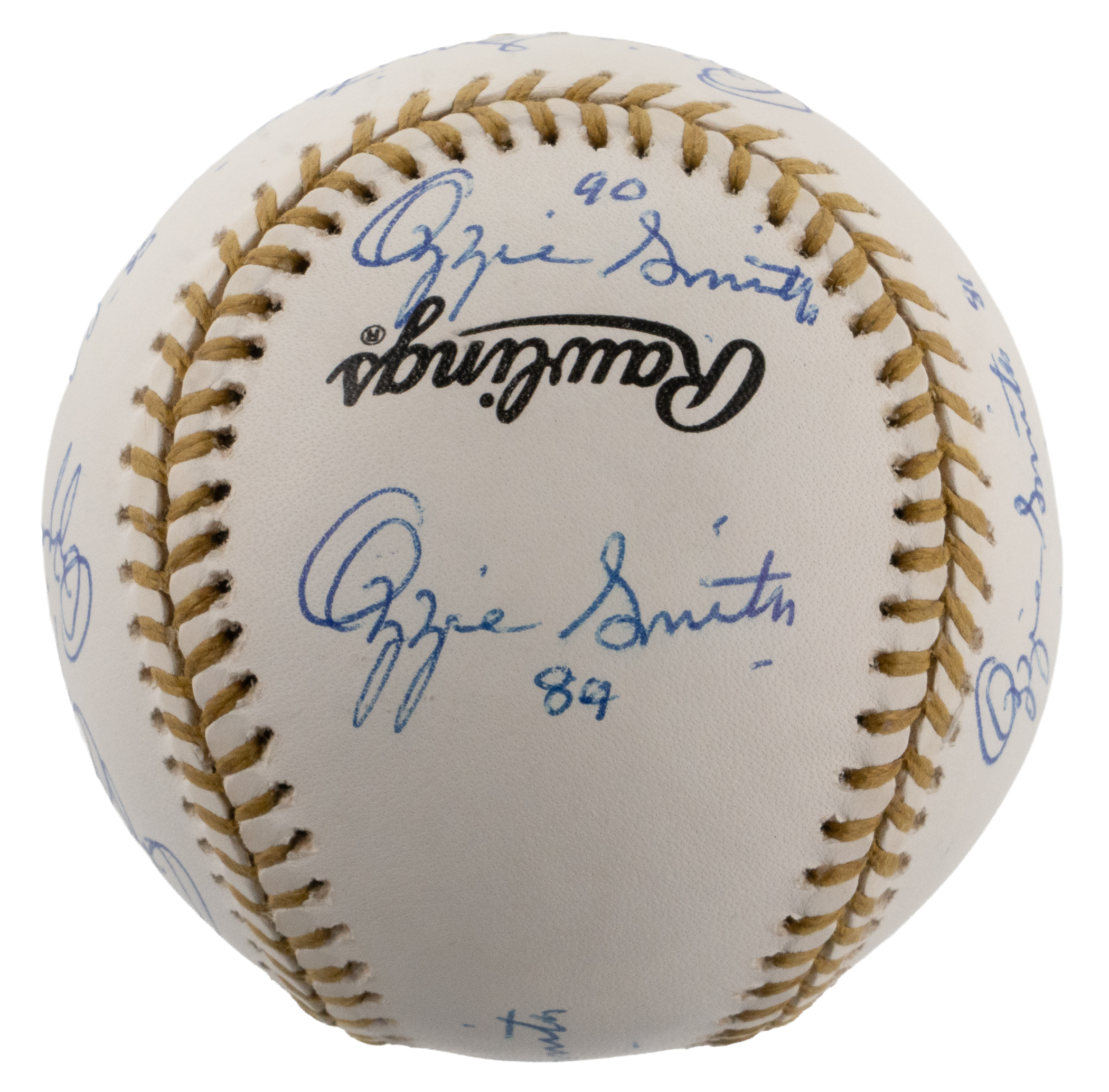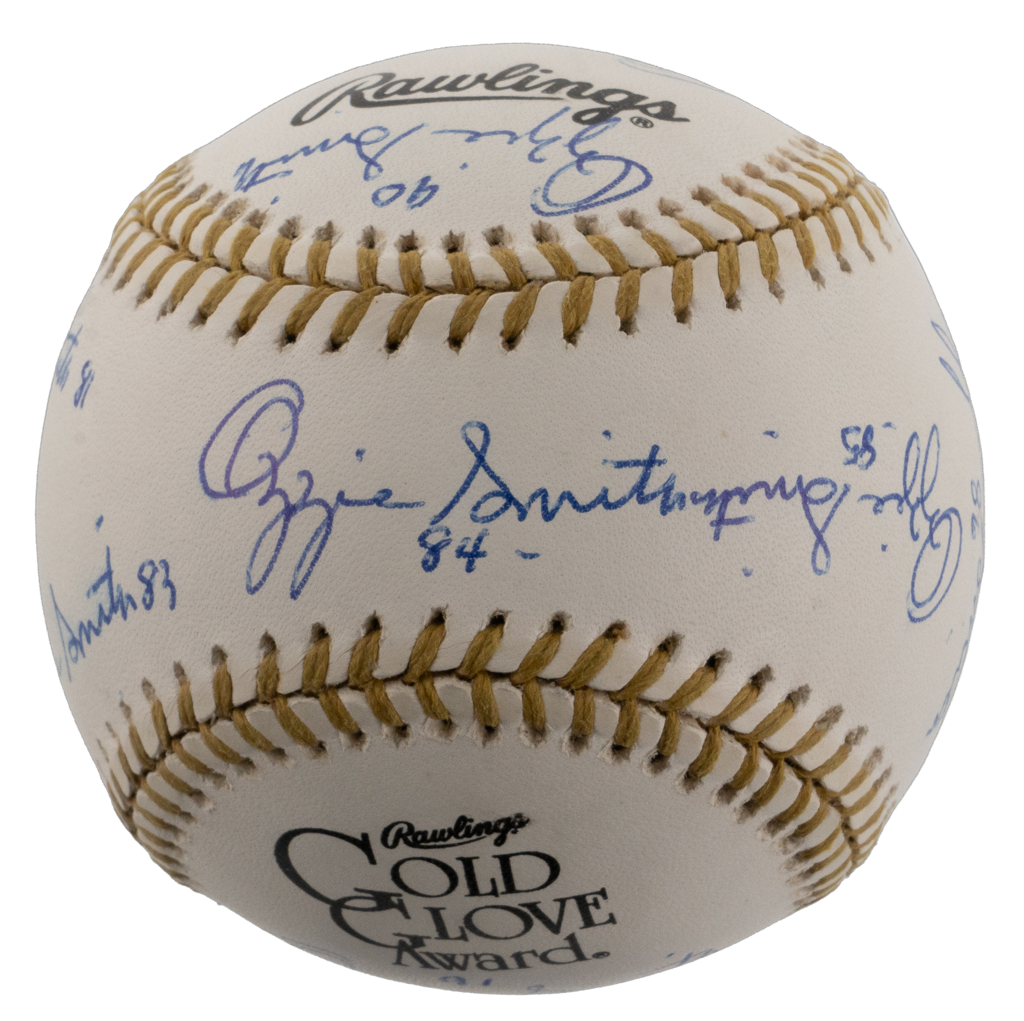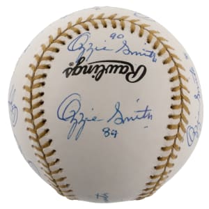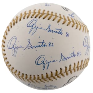 In honor of earning 13 consecutive Gold Glove awards from 1980-1992, Hall of Fame shortstop Ozzie Smith has signed the offered Rawlings Official Gold Glove baseball (13) times. Known as “The Wizard of Oz” for his spectacular defensive play, capable batting, and acrobatic backflips, Smith has included a different date inscription with each of his signatures, with one example for each year of his remarkable Gold Glove streak. Accented with gold stitching, this baseball is bright and clean and Smith’s thirteen signatures are all distinct applications.