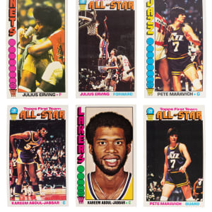 "Go big or go home" was obviously the thought in the company board room for the 1976-1977 Topps Basketball edition. This "jumbo sized" 144-card complete set averages overall (EX-MT to NM) quality throughout. Highlights include: #1 Erving (EX-MT), #48 CL (EX-MT), #50 Barry (EX-MT), #57 Walton (EX-MT), #60 Maravich (NM), #68 Gervin (EX-MT), #100 Abdul-Jabbar (EX-MT), #101 M. Malone (EX-MT), #110 D. Thompson RC (EX-MT), #126 Abdul-Jabbar AS (NM), #127 Erving AS (NM) and #130 Maravich AS (NM).