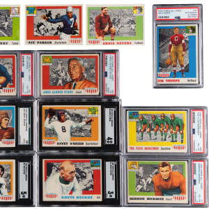 Suit up for the offered 1955 Topps All-American Football complete set of (100) cards with (10) graded keys. These graduates have an overall approximate condition breakdown of 20% (EX or better), 25% (VG-EX), 35% (VG) and 20% (GD or lesser). Highlights include: #1 Hickman RC (PSA VG-EX 4), #6 Kinnick RC (VG), #12 Graham (GD), #16 Rockne (SGC VG 3), #20 Baugh (VG), #21 W. White RC (BVG Authentic-Altered), #22 Muller (SGC VG/EX 4), #24 Strong (GD), #27 Grange (PSA VG-EX 4), #28 Hein RC SP (VG-EX), #29 Nomellini SP (VG), #34 O’Brien RC (SGC VG/EX 4), #35 Harmon RC SP (EX), #36 Edwards SP (GD), #37 Thorpe (PSA Authentic-Altered), #38 Stagg RC (PSA VG 3, mk), #52 Lujack (VG-EX), #56 Nevers RC (GD), #59 Blanchard RC (VG-EX), #68 Four Horsemen RC SP (PSA VG-EX 4), #84 Parker RC SP (EX), #85 Luckman (VG), #97 Hutson RC SP (SGC EX 5), #98 Feathers RC SP (VG-EX) and #100 Henry RC SP (VG).