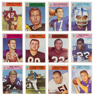 The offered 1966 Philadelphia Gum Football complete set of (198) cards features a stellar Hall of Fame rookie crop and a clean high-grade wrapper. This gallery has an overall approximate condition breakdown of 15% (EX-MT or better), 25% (EX), 30% (VG-EX) and 30% (VG or lesser). Highlights include: #21 signed L. Moore (“9”, FR, reverse writing, no cert), #24 Unitas (VG), #31 Butkus RC (VG), #32 Ditka (EX-MT), #38 Sayers RC (GD), #39 Bears/Sayers (EX), #41 J. Brown (VG), #58 Hayes RC (VG-EX), #59 Howley RC (VG), #60 Lilly (EX), #61 Meredith (VG), #88 Starr (VG), #114 Tarkenton (VG), #104 C. Taylor (EX-MT), #197 CL (VG) and #198 CL (VG).