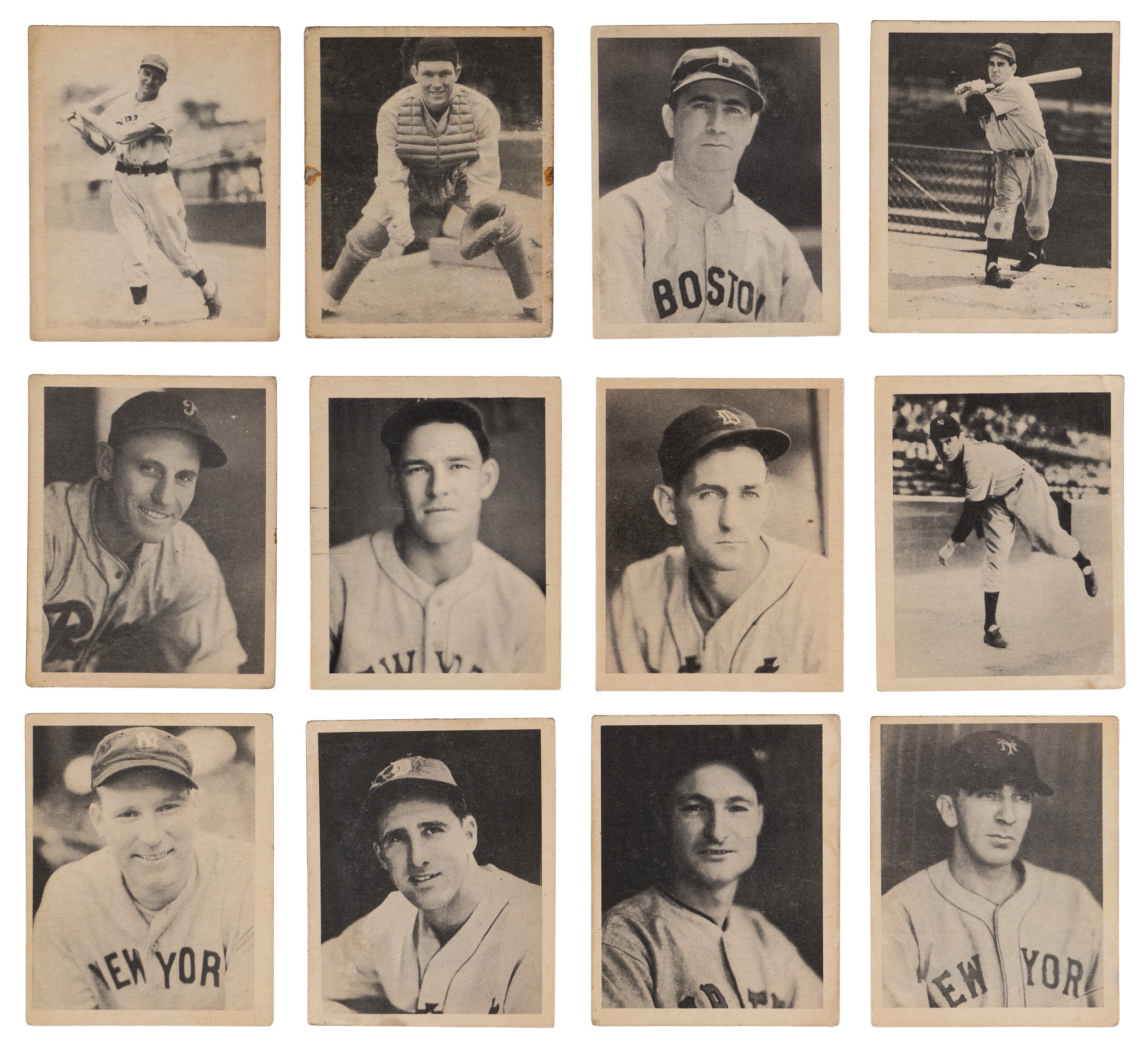 The pre-war collector will treasure the offered 1939 Play Ball near complete set of (144/161) cards. This black-and-white edition has an approximate condition breakdown of 20% (EX or better), 20% (VG-EX), 35% (VG) and 25% (GD or lesser) with the challenging high numbers generally presenting similarly to the more available numbers. Highlights include: #1 Powell (VG-EX), #3 Ruffing (VG), #6 Durocher (EX-MT), #7 Doerr (VG), #30 Dickey (PR), #39 R. Ferrell (FR, ink stain), #48 Gomez (GD), #50 Gehringer (EX-MT), #51 Ott (VG), #52 Henrich (VG), #53 Hubbell (VG-EX), #55 Vaughan (PR, reverse stamp), #56 Greenberg (GD, stain), #82 Klein (FR, reverse tape), #88 Keller (VG), #89 L. Waner (VG). #94 Manush (EX), #103 Berg (VG-EX), #112 P. Waner (FR, reverse tape) and #143 Averill (VG).