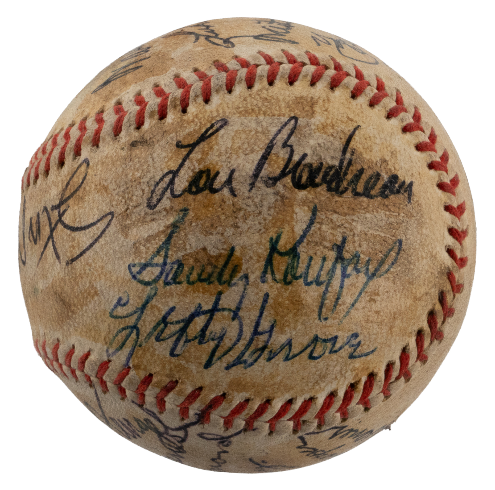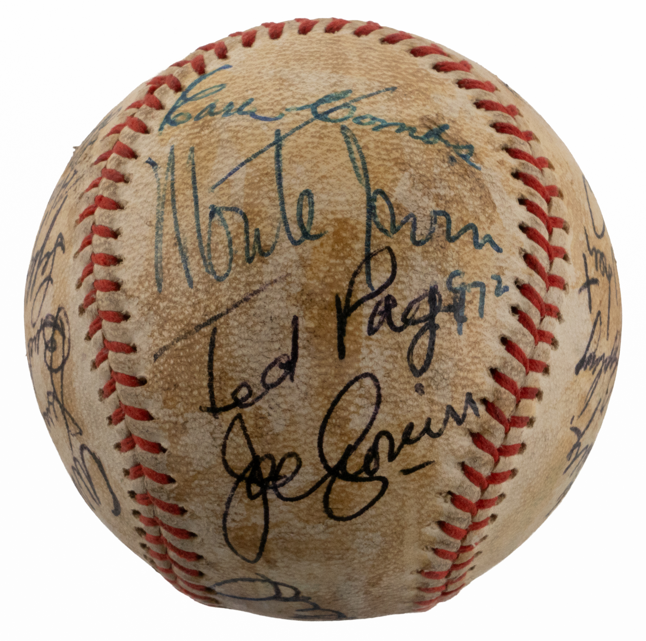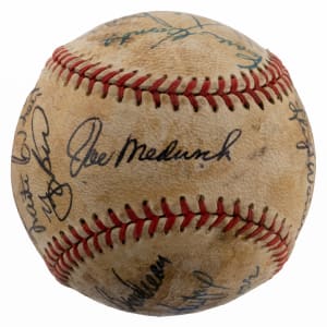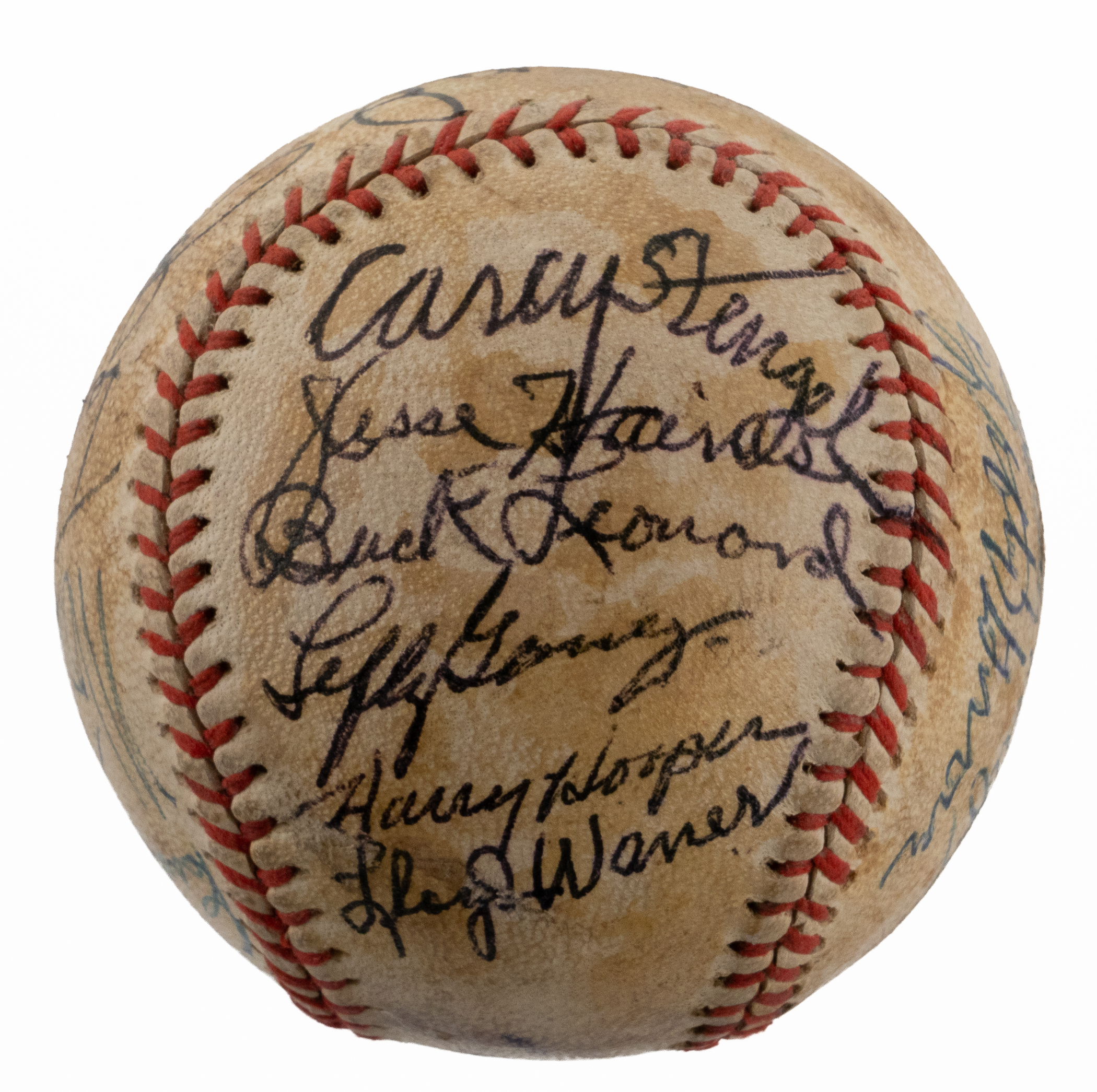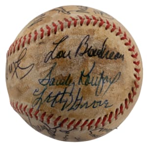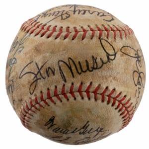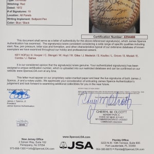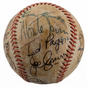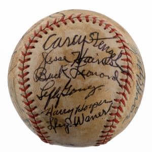 A total of (19) baseball luminaries who were gathered for the 1972 Hall of Fame induction ceremony, have contributed to the signing of the offered baseball. No factory labeling stamps are visible on this ball, and the surface has toned unevenly from a coating of shellac. Even so, the signatures are so potent that they show off proudly against the darkened surface. All but one of the signers are Hall of Fame members, including four inductees from the Class of ’72.