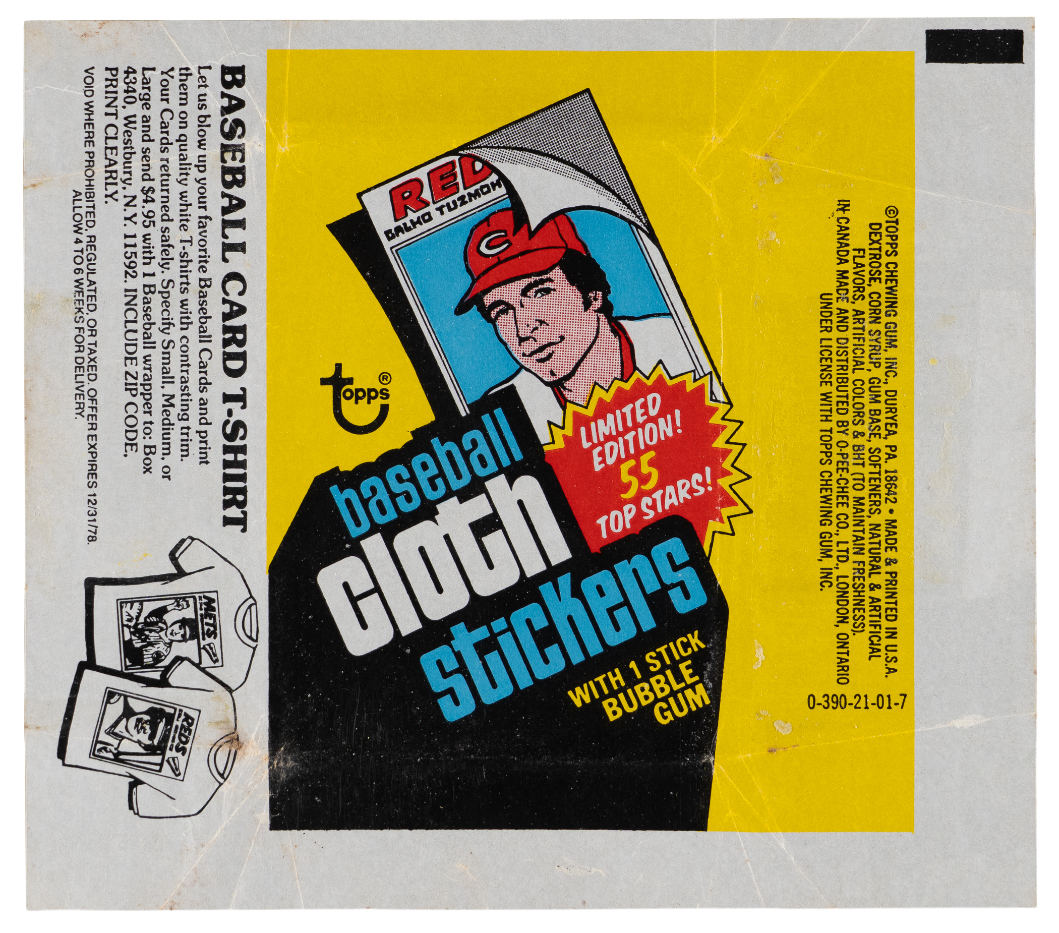Full 1977 Topps Cloth Stickers collection including the 55-card base set plus both American and National League Checklist sets (9 cards each) and a clean wrapper. This average (NM) collection is highlighted by the following: #3 Bench (NM), #7 Brett (EX-MT), #22 R. Jackson (NM), #30 Rose (NM), #32 Munson (NM), #40 Ryan (NM), #41 Schmidt (NM), #42 Seaver (EX-MT), #53 Yastrzemski (NM) and #54 Yount (NM-MT).