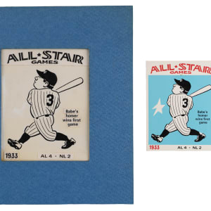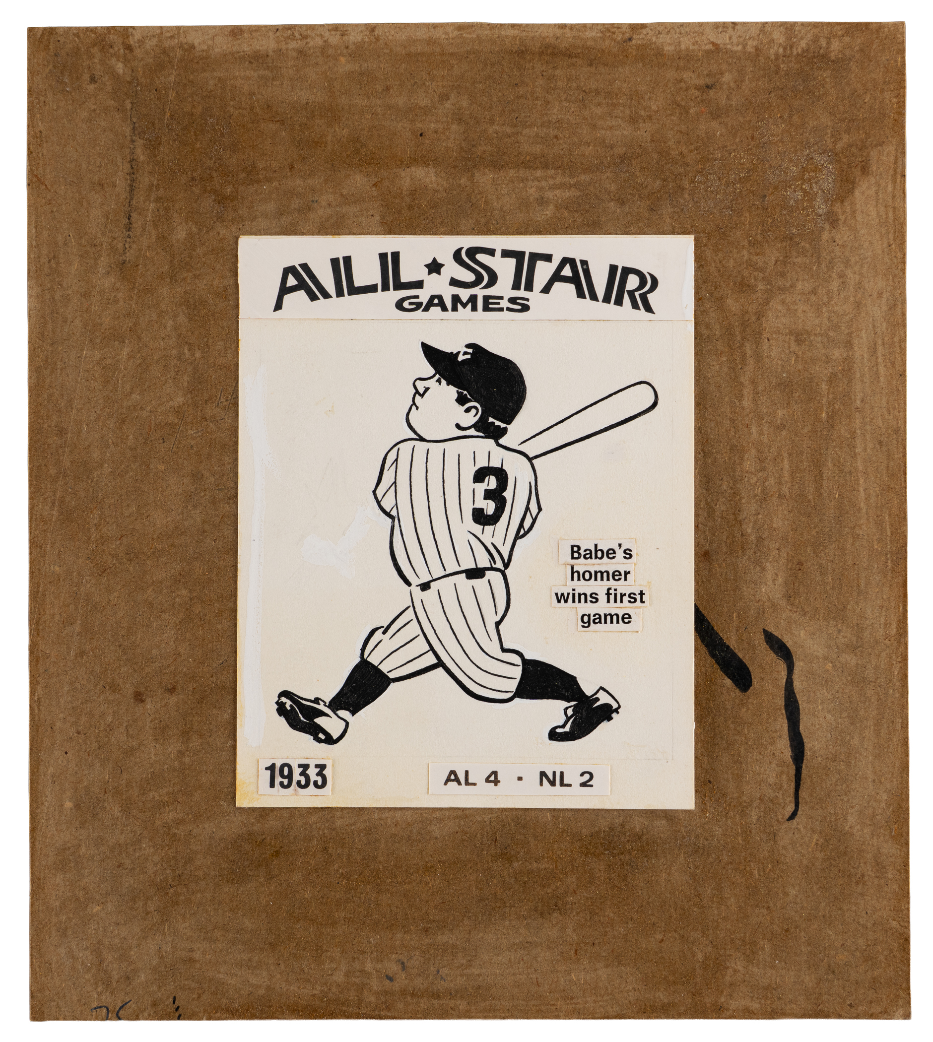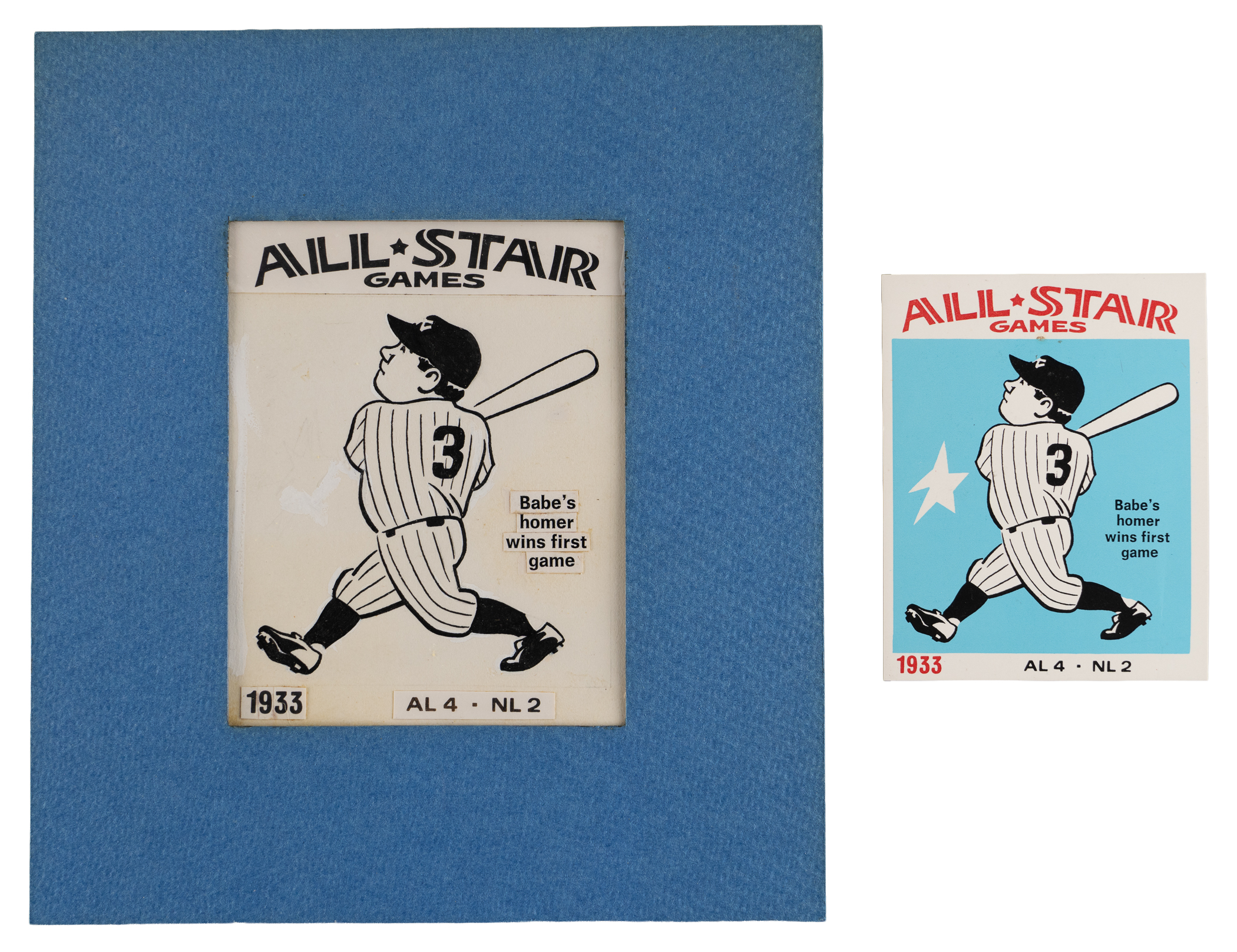 Sports artist Robert Laughlin created a true masterpiece with the offered 1974 Laughlin All-Star Babe Ruth original artwork. Matted to overall 6-1/2 x 7-1/2" dimensions, this true #1/1 production art documents the New York Yankees Hall of Famer crushing a homer in the inaugural 1933 All-Star game. The artwork is accented by black overlays detailing the event particulars. Survives in premier condition and is a fine candidate for framing and prominent display. The mainstream trading card (NM) is also present.