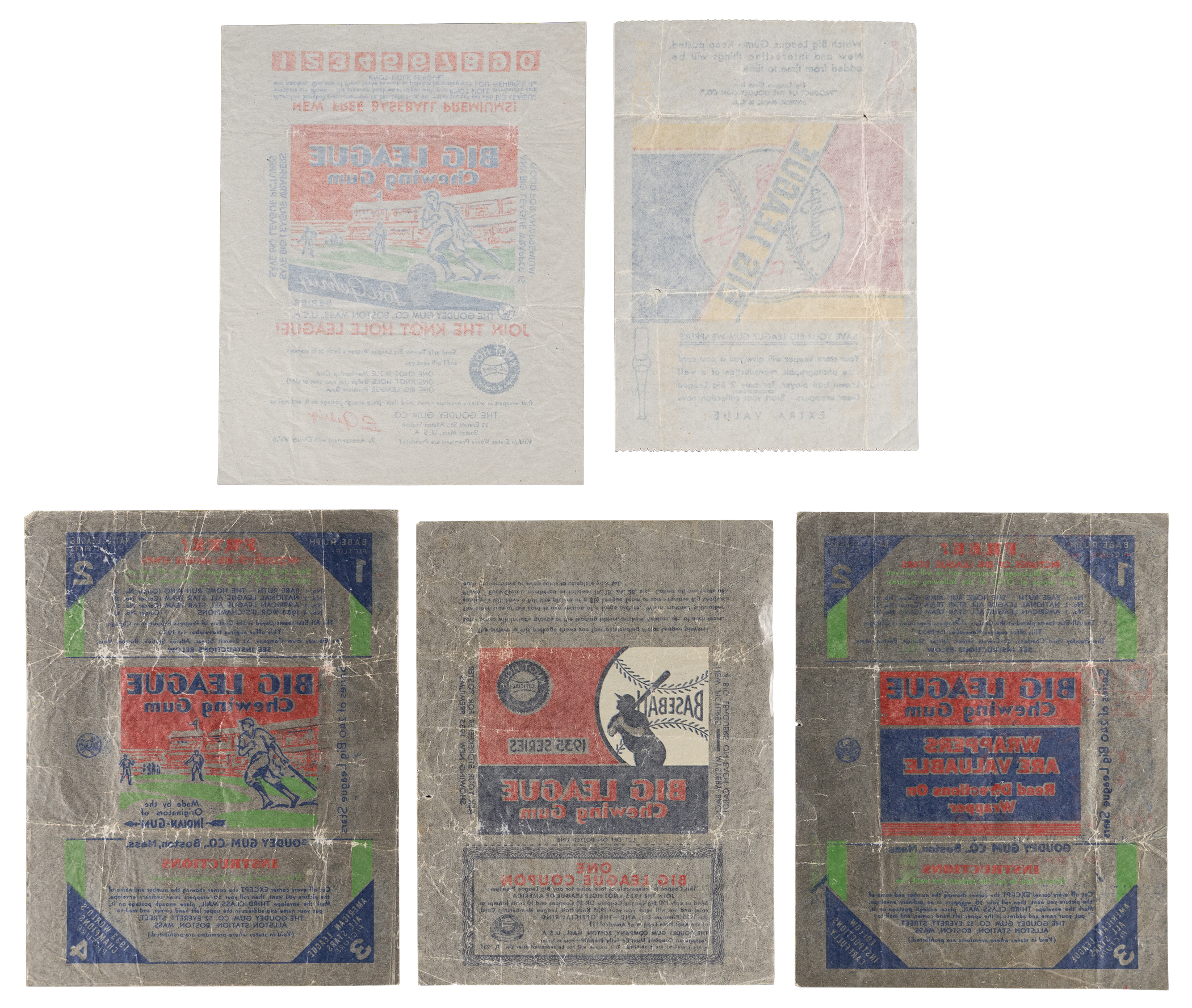 Archive of five different 1933-1936 Goudey wrappers featuring multiple tough examples. These unfolded wrappers display vibrant surface colors and are almost entirely absent of perimeter tearing or notching. Includes: (2) 1933 Goudey (different ad versions), 1934 Goudey (with Lou Gehrig), 1935 Goudey and 1936 Goudey (slight perimeter tear).