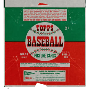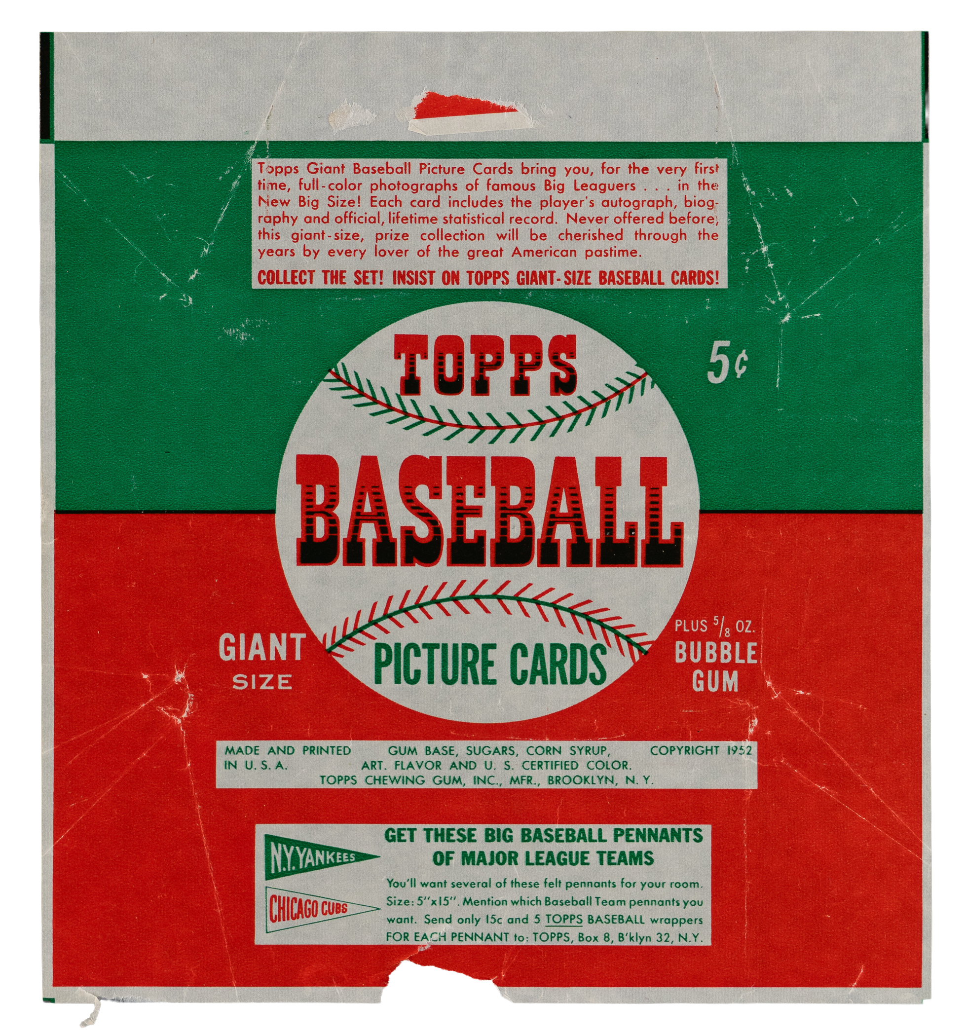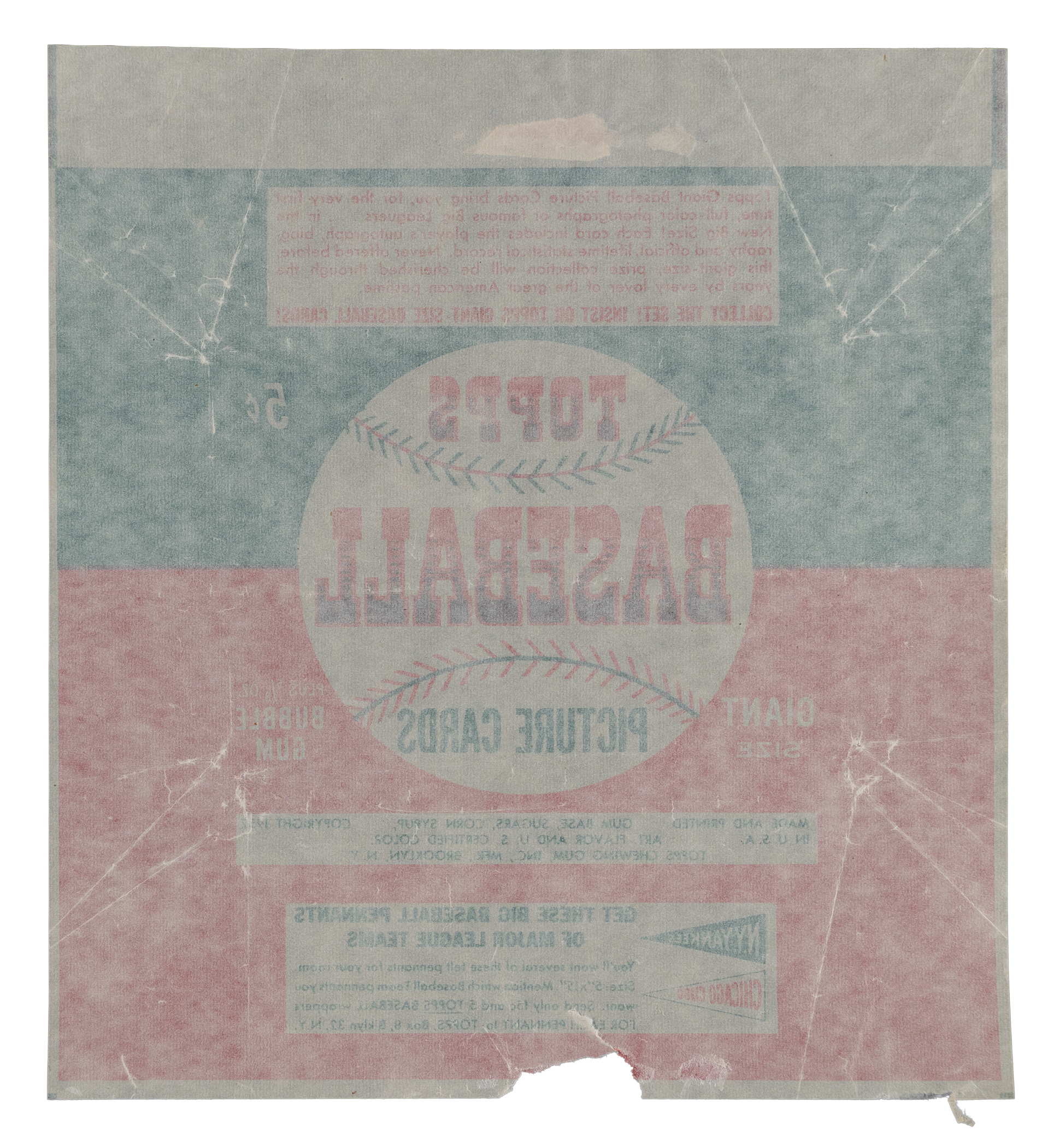 What cards this could have held?! Sy Berger's brainchild is realized with the offered 1952 Topps five-cent wrapper. While this "giant size" artifact with the "big baseball pennants" promotion displays a missing chunk along the bottom edge, the waxy surface is otherwise crisp with bold period advertising graphics.