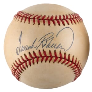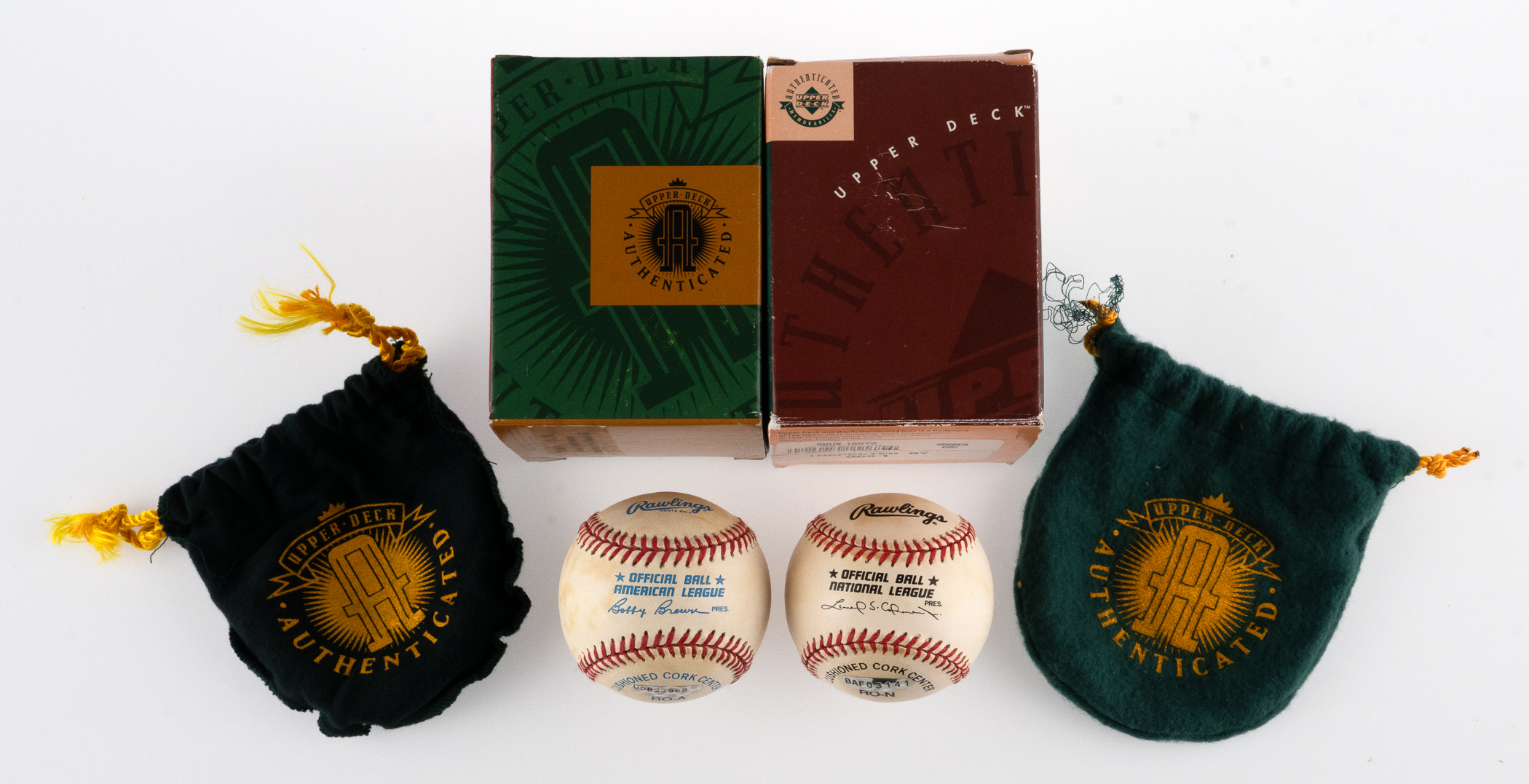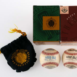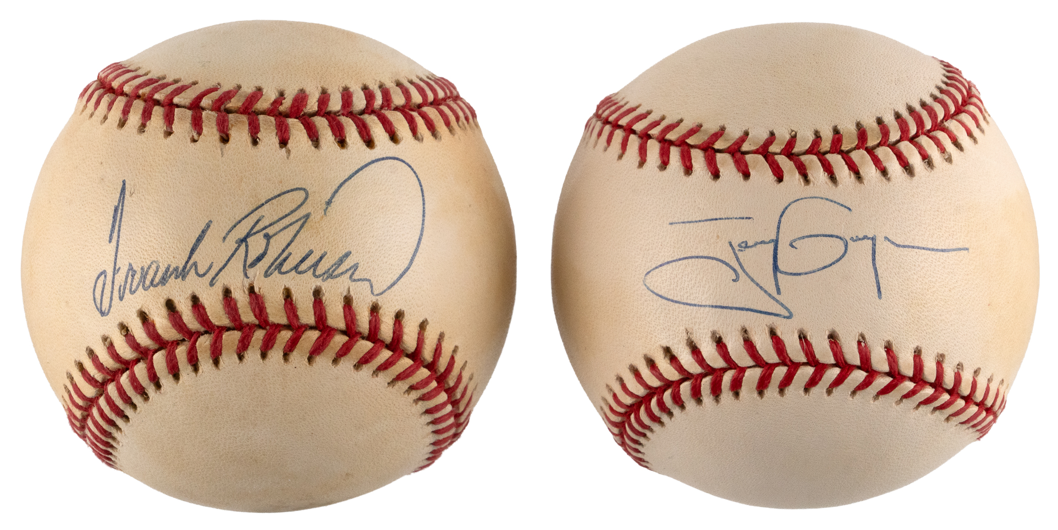 A pair of certified treasures is at hand, in the form of (2) single-signed baseballs. Hall of Famers Tony Gwynn and Frank Robinson are the subjects, with both legends having supplied pleasing sweet spot signatures. Gwynn has signed an ONL/Coleman ball, and Robinson has signed an OAL/Brown ball. Both baseballs are sporadically toned, but handsome with bold labeling stamps. Each comes with an individual UDA COA/sticker, felt bag, and box.