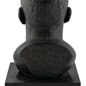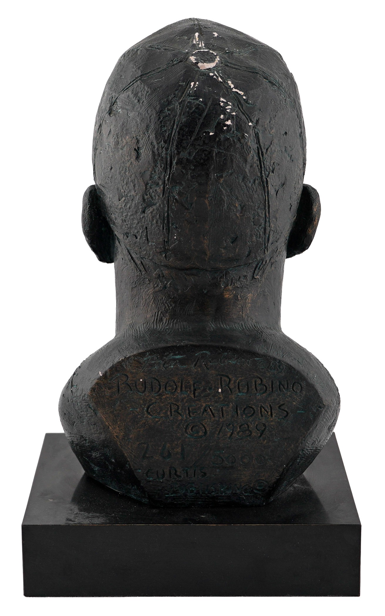 The immortal “Babe” Ruth made an art out of hitting baseballs. Fittingly the “Babe” has been immortalized in art with this limited edition sculpture. Created by renowned artist Peter Rubino, this plaster cast artwork is finished with a bronze patina and displays amazingly life-like detail. Minor to moderate surface wear is present in the form of small paint chips scattered about the hat. This 1989 bust edition measures approximately 12” tall above the base to the cap peak by 7” wide across the baseball neck portion by 8” deep from the cap brim to the back, on a 9x7x2 base. It is LE numbered “261/5000” and etched-signed “Rudolf-Rubino Creations ©1989” along with the artist Rubino’s etched-signature and “Curtis Publishing” on the back. Showing exacting facial details Ruth’s head emerges from a baseball at the neck and a facsimile “Babe Ruth” signature appears on the ball at the five o’clock position. A tremendous addition to any Ruth or Yankees collection.
