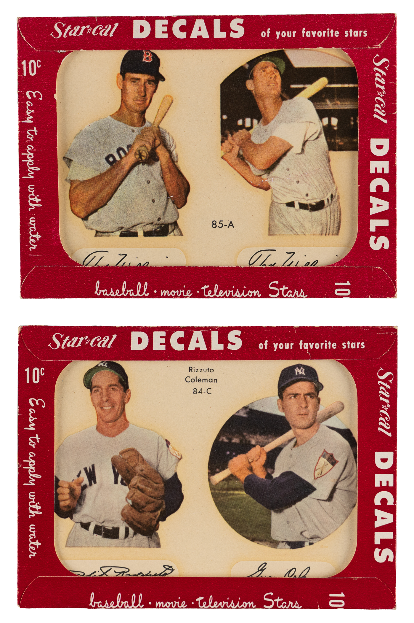 Nifty pair of 1952 Star-Cal Decals Type 2 singles in their original envelopes. Includes: 1.) #84-C Rizzuto/Coleman (EX-MT) and 2.) #85-A T. Williams (EX-MT).