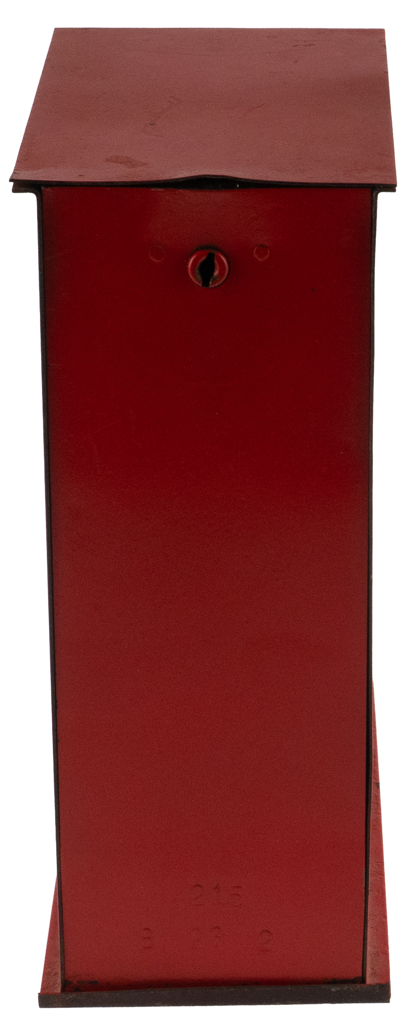 It’s all about display appeal, with this 1940s Exhibit Supply Co. penny card vending machine. This mid-century metal marvel stands 10” tall, with a 4” x 9-1/2” footprint. Black bands at top on the sides are printed identically with “Exhibit Supply Co’s Cards”, with one side presenting good integrity, while the other is considerably faded. The coin slot at front accepts one cent coins, and has been tested to function smoothly, though the empty card reservoir has been tested. A glass panel above the coin slot is removable. Housed behind the glass pane is a 1970s Exhibit reprint card of Mickey Cochrane. While the key is absent, the rear access panel is not locked and can be removed easily, to access the interior. The red exterior paint shows strong integrity all around, and overall display appeal is outstanding. Accompanying is a bracket for base mounting.