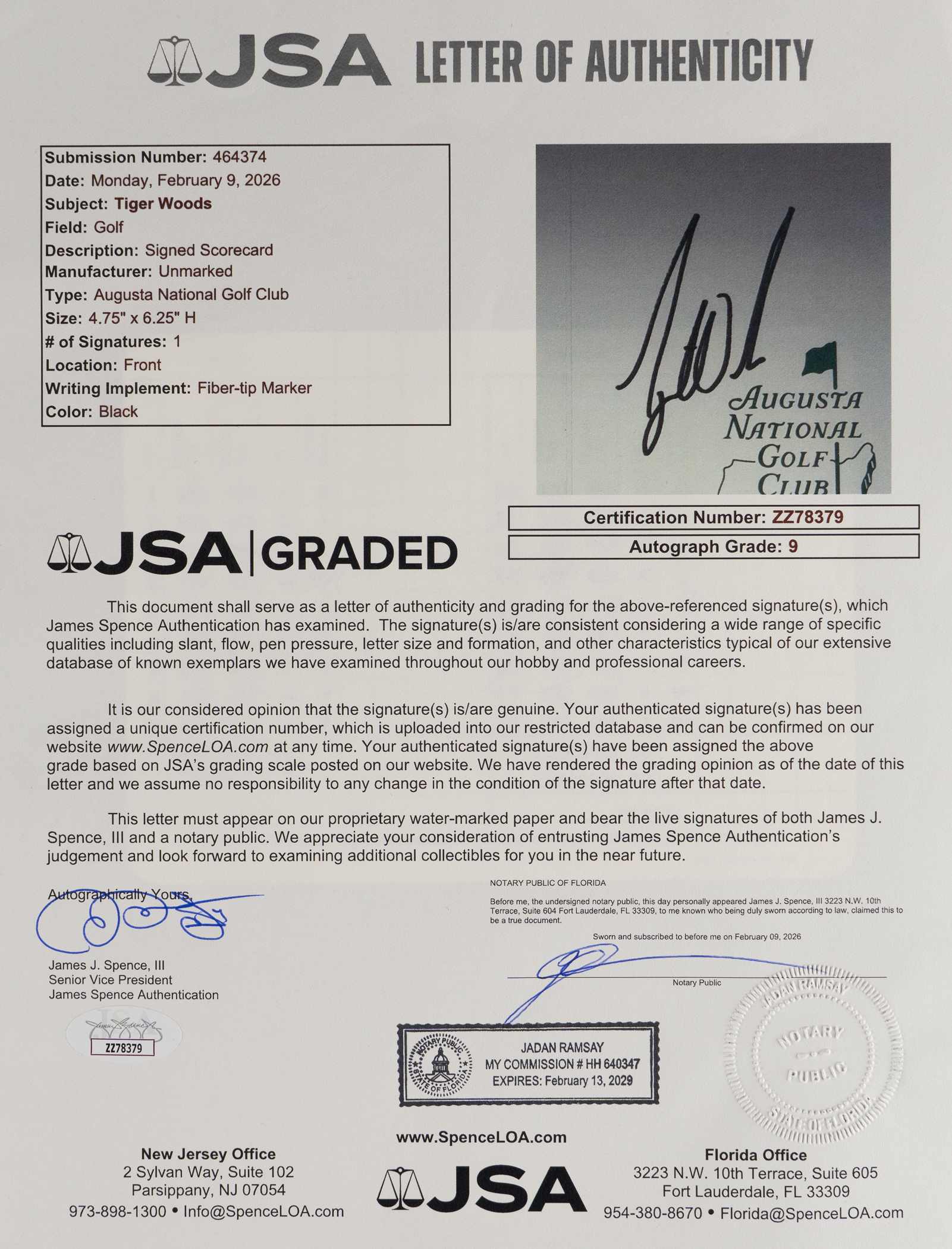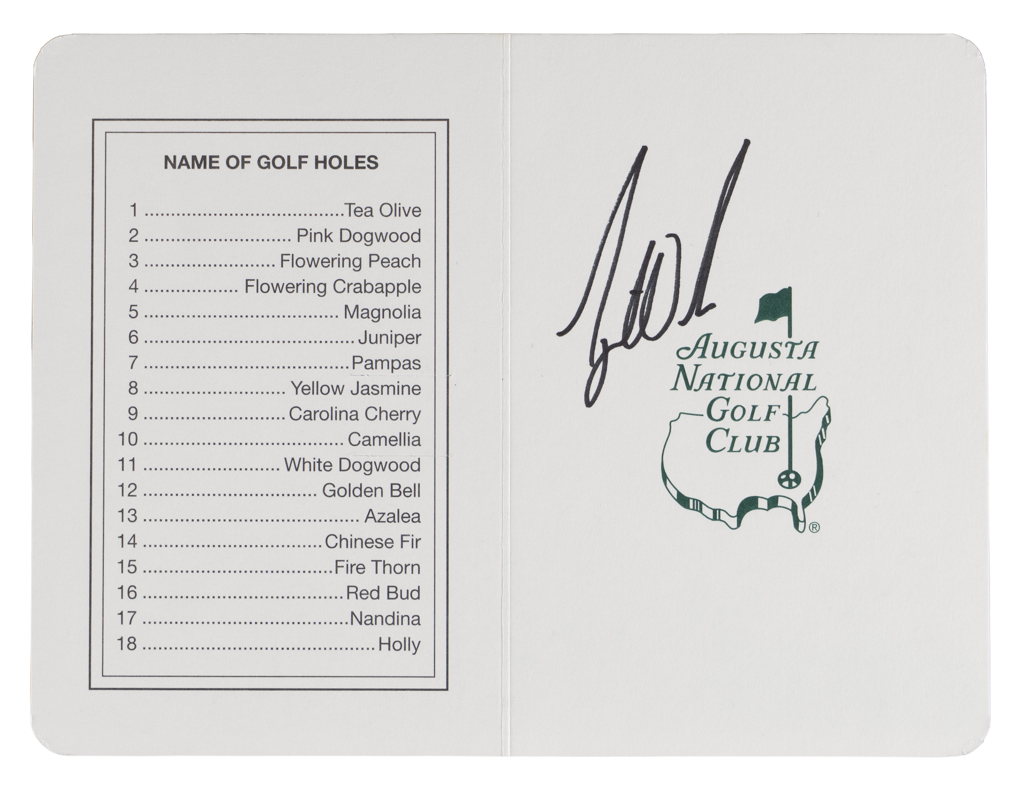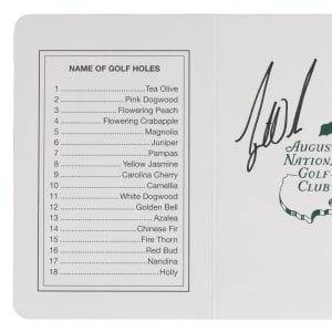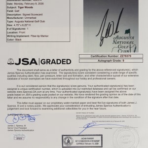 Auto 9 Grade! The top golfer of the past fifty years tees up a winner with this signed scorecard. "Tiger" Woods is widely regarded as one the top five greatest golfers of all-time, and the debate often boils down to him or Jack Nicklaus for recognition as the best ever. Woods has delivered a winning stroke, applying an extremely bold signature on the front of this bright, clean Augusta National Golf Club scorecard. This prestigious club is well-known as the site of the Masters Tournament, an event Woods has won five times between 1997-2019. Full LOA from James Spence/JSA.