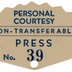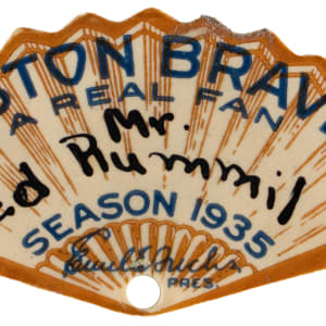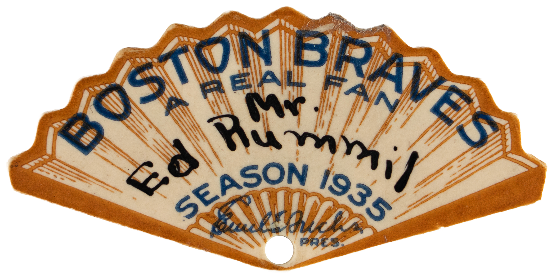 From the land of “you don’t see one these everyday”, comes this 1935 Boston Braves celluloid season press pass. Issued during “Babe” Ruth’s final season, and his only one with the Boston Braves, this relic is an exceedingly rare find. A visual pun, this 2” x 1” celluloid pass is formatted as a handheld fan. Printed on the obverse is the legend “Boston Braves, A Real Fan, Season 1935”. The name of longtime Boston sportswriter Mr. Ed Rumill is written boldly on the obverse, with his surname misspelled as “Rummill”. Rumill covered the Red Sox and the Braves, mostly writing for The Christian Science Monitor, but also for The Sporting News. Printed on the reverse is “Personal Courtesy, Non-Transferable, Press No. 39”. At bottom, is a pre-punched hole, with the facsimile signature of team president Emil Fuchs located directly above on the obverse. The surface is clean, the graphics and lettering are bold, and the edges are sharp, while wear in minimal, adding up to Nm rating for this rare press pass.