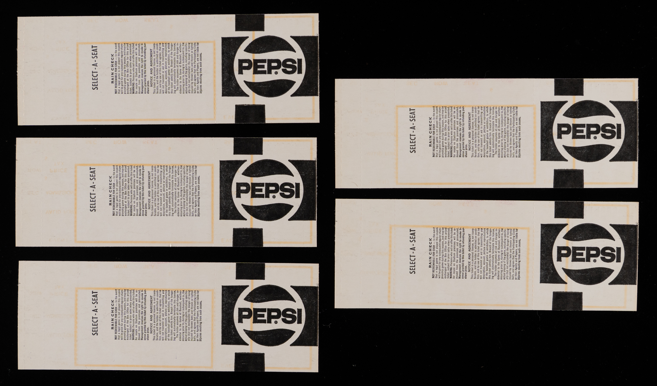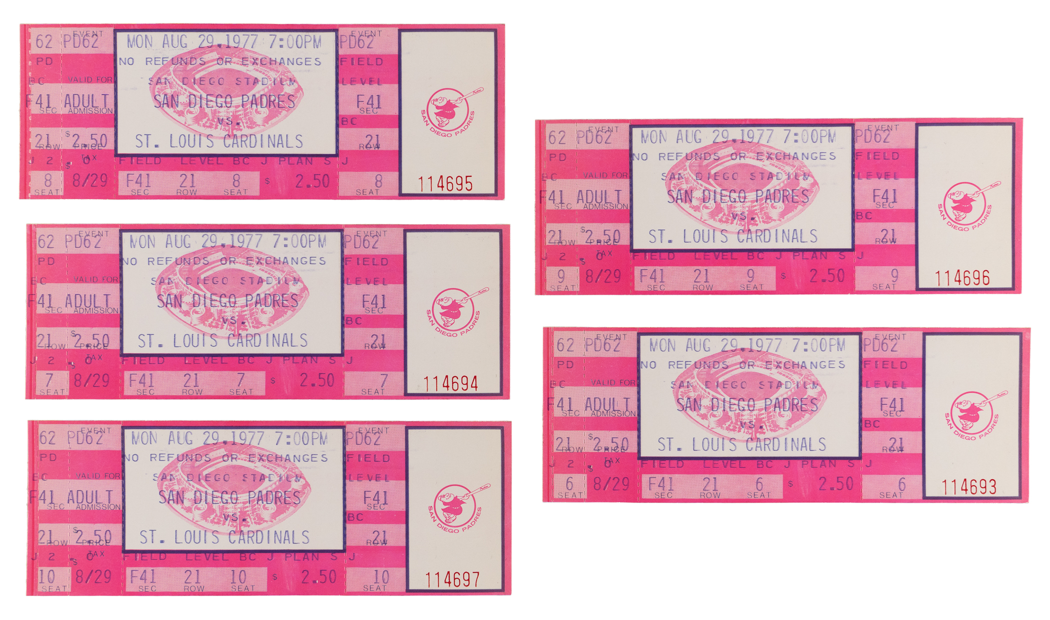 Collection of five upper-grade unused, full tickets from the game in which Lou Brock would surpass Ty Cobb for the most all-time stolen bases in Major League history. Played on a Monday night at San Diego Stadium on August 29, 1977, the game would go on to see the hometown Padres defeat the St. Louis Cardinals by a 4-3 score. More importantly, Hall of Famer Lou Brock would steal two bags to claim the title of MLB's All-Time leader. Fantastic relics that present in stellar overall condition.