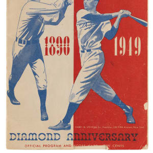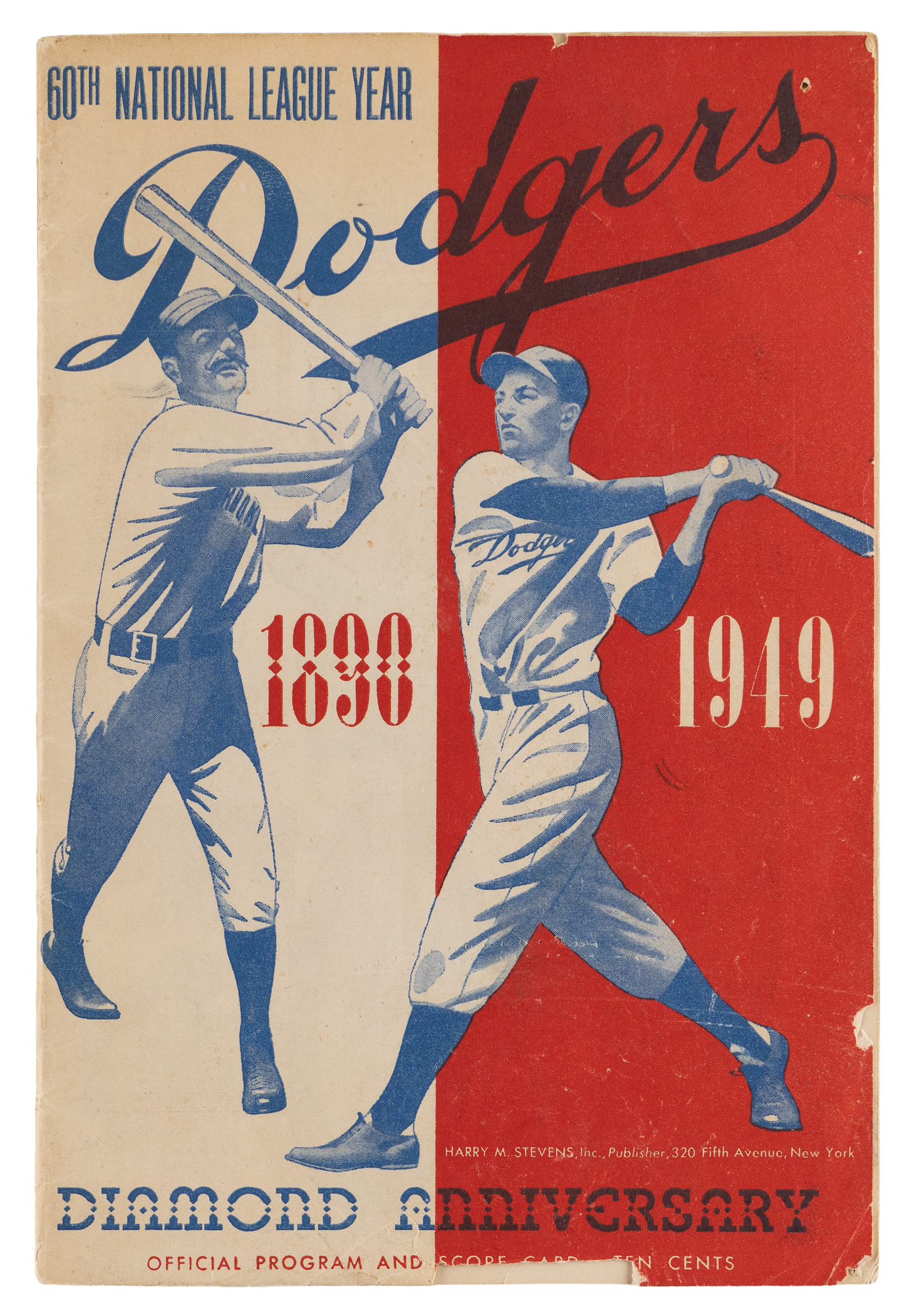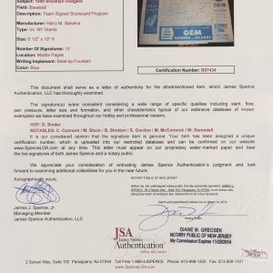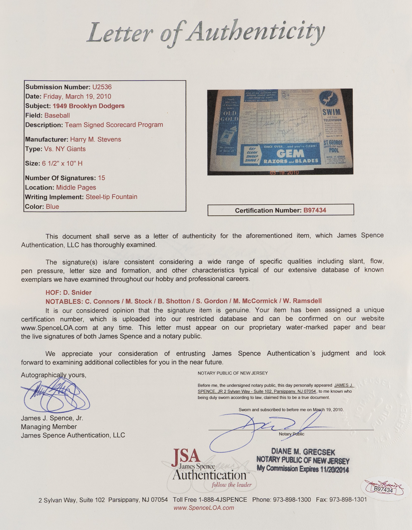 The sun is shining, the birds are chirping, the flowers are in bloom, and you're taking your seat at the Opening Day game. Even the skeptical fans of "Dem Bums" from Brooklyn enjoyed the rights of Spring, no matter how the season played out. 1949 turned out to be one of the high points for the Brooklyn Dodgers, as they finished first to earn a shot at their dreaded crosstown rivals in the World Series, the New York Yankees. From the first game of the Dodgers 1949 season, comes this multi-signed opening day program. More than a bit weathered with some damage on both the front and back covers, this vintage gameday souvenir still stacks up a nice find, thanks to a total of (16) autographs spread across the centerfold scoring grid pages. Both of the signed pages report in crisp and clean condition, with the signatures ranging ("7" to "9") in potency. Noted among the signatures are several tough examples from long deceased players and coaches, along with Edwin "The Duke of Flatbush" Snider, and first baseman turned TV "Rifleman", Chuck Connors. The complete list of signers is: Ralph Branca, Rex Barney, Burt Shotten (manager, d.1962), "Buddy" Kerr (1949 NY Giants), Gene Hermanski, Willie Ramsdell (d.1969), Eddie Miksis, "Spider" Jorgenson, "Duke" Snider (HOF), Paul Minner, Mike McCormick (d.1976), Sid Gordon (1949 NY Giants, d.1975), Milt Stock (coach, d.1977), Chuck Connors (rookie season autograph, d.1992), Johnny Van Cuyk, and Pat McGlothin. The Dodgers opponents for the first series of the 1949 season were the New York Giants, accounting for the presence of Kerr and Gordon among the signers. Full photo LOA from JSA.