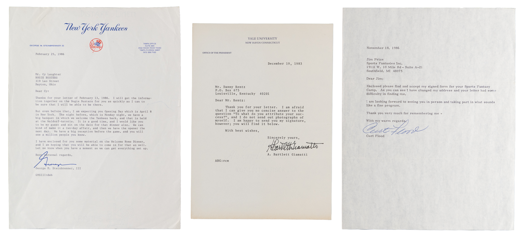 Bart Giamatti (deceased 1989) - Dated to December 19, 1983 and addressed to Danny Rentz on Yale University letterhead.