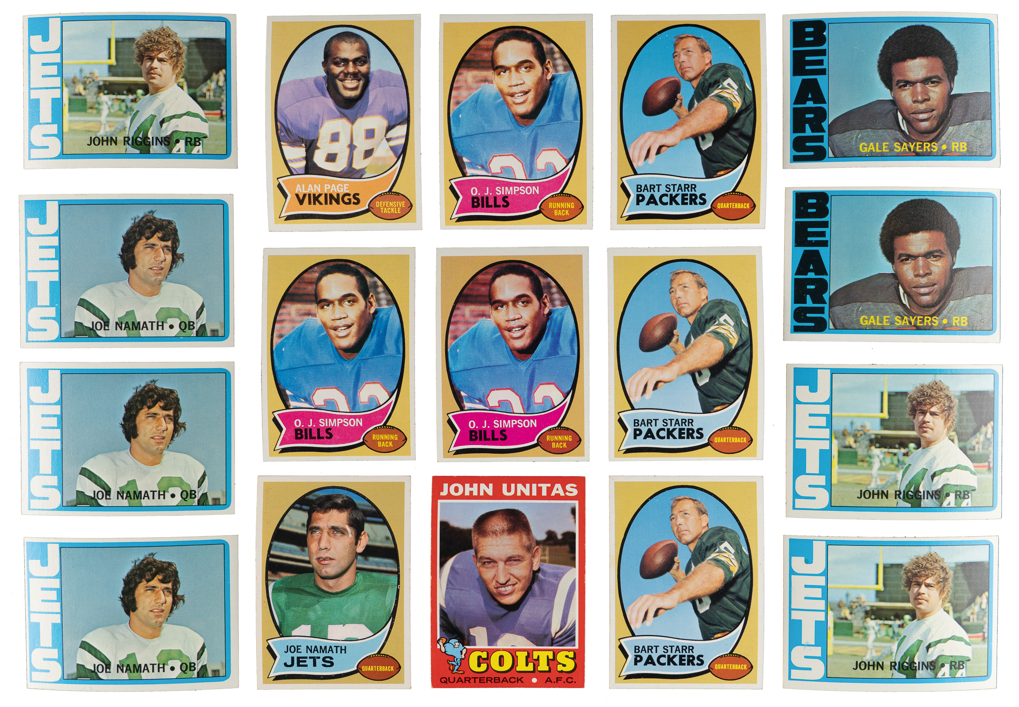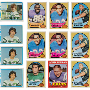 1970 Topps: (303 cards, average NM) with #1 Dawson (VG-EX), (2) #10 Griese (EX, VG-EX), (3) #30 Starr ((2) NM-MT, NM), #59 Page RC (EX-MT), (3) #75 Barney RC ((2) NM-MT, NM), #80 Tarkenton (EX-MT), (3) #90 Simpson RC (NM, (2) EX-MT), (3) #114 B. Smith RC (NM, EX-MT, VG), #150 Namath (EX-MT);