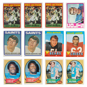 1971 Topps: (70 cards, average EX-MT to NM) with #1 Unitas (EX-MT), #3 Schottenheimer RC (EX), #25 Butkus (EX), #114 Lanier RC (EX-MT);