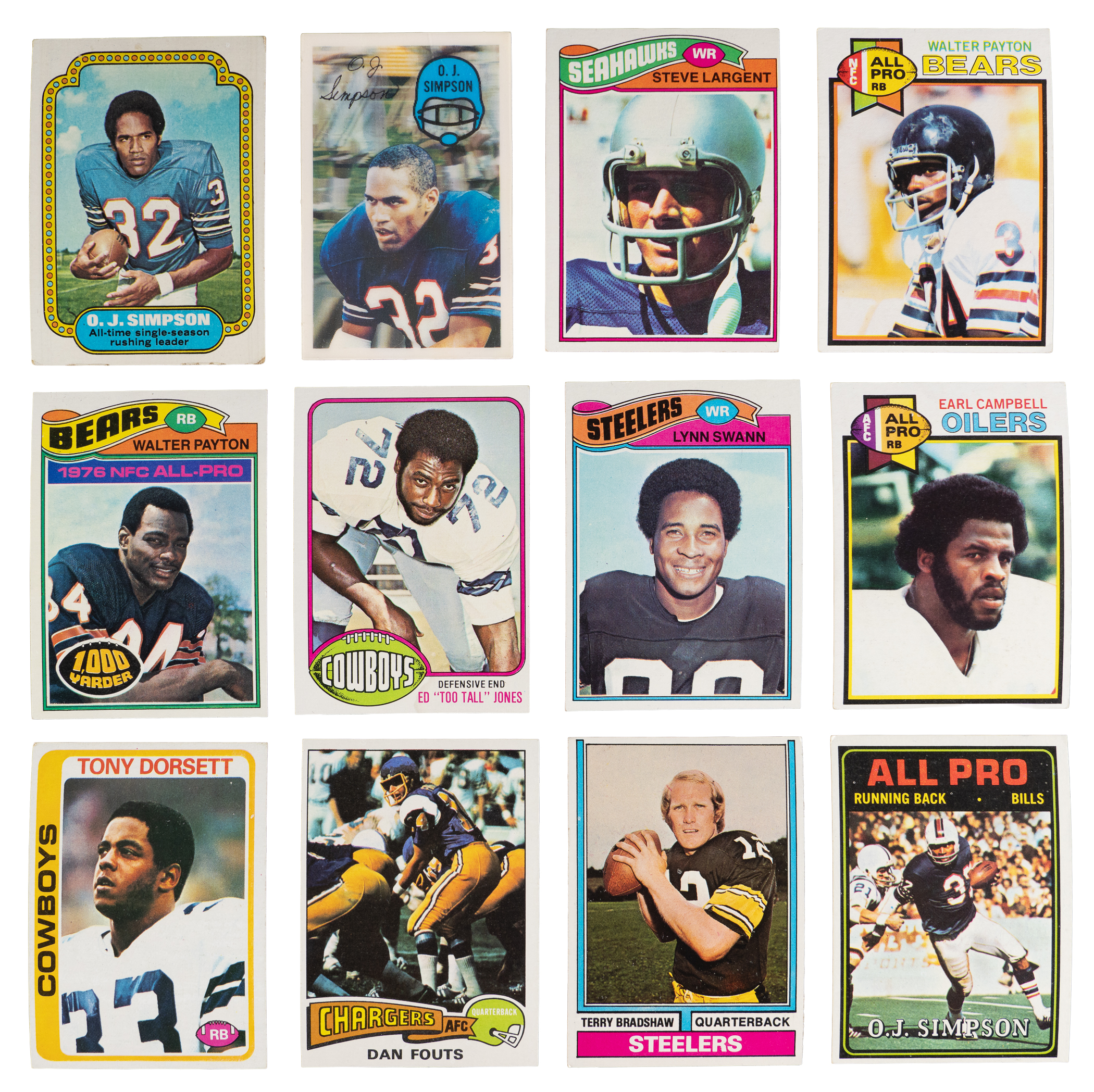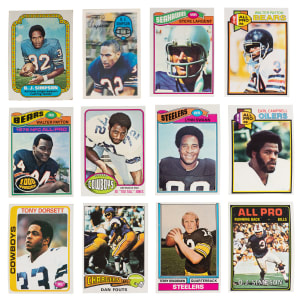 1977 Topps: (44 cards, average EX) with #45 Staubach (EX-MT), #177 Largent RC (VG-EX), #195 Swann (EX), (4) #245 Bradshaw (average EX), (5) #300 F. Harris (average VG-EX), #360 Payton (EX-MT), #397 Papale RC (EX-MT);