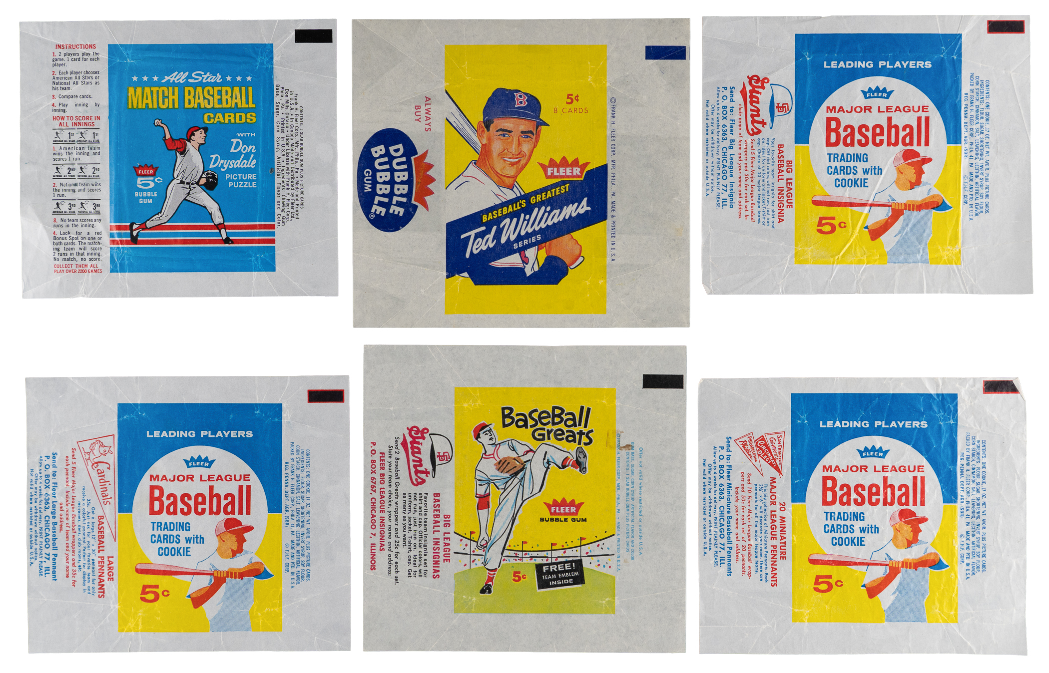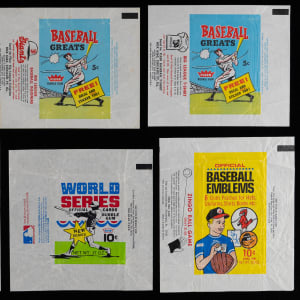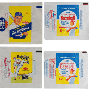 Fleer Wrappers: (32 wrappers) with 1959 Fleer Ted Williams, 1960 Fleer Greats, (3) 1961 Fleer Greats (different ads), (3) 1963 Fleer (different ads), 1966 Fleer All-Star Match, 1968 Fleer Emblems, 1969 Fleer Patches, (12) 1970s Cloth Patches, 1970 Fleer World Series, 1971 Fleer World Series, 1981 Fleer, (2) 1981 Fleer Star Stickers (different ads), (2) 1982 Fleer, 1982 Fleer rack, 1984 Fleer;