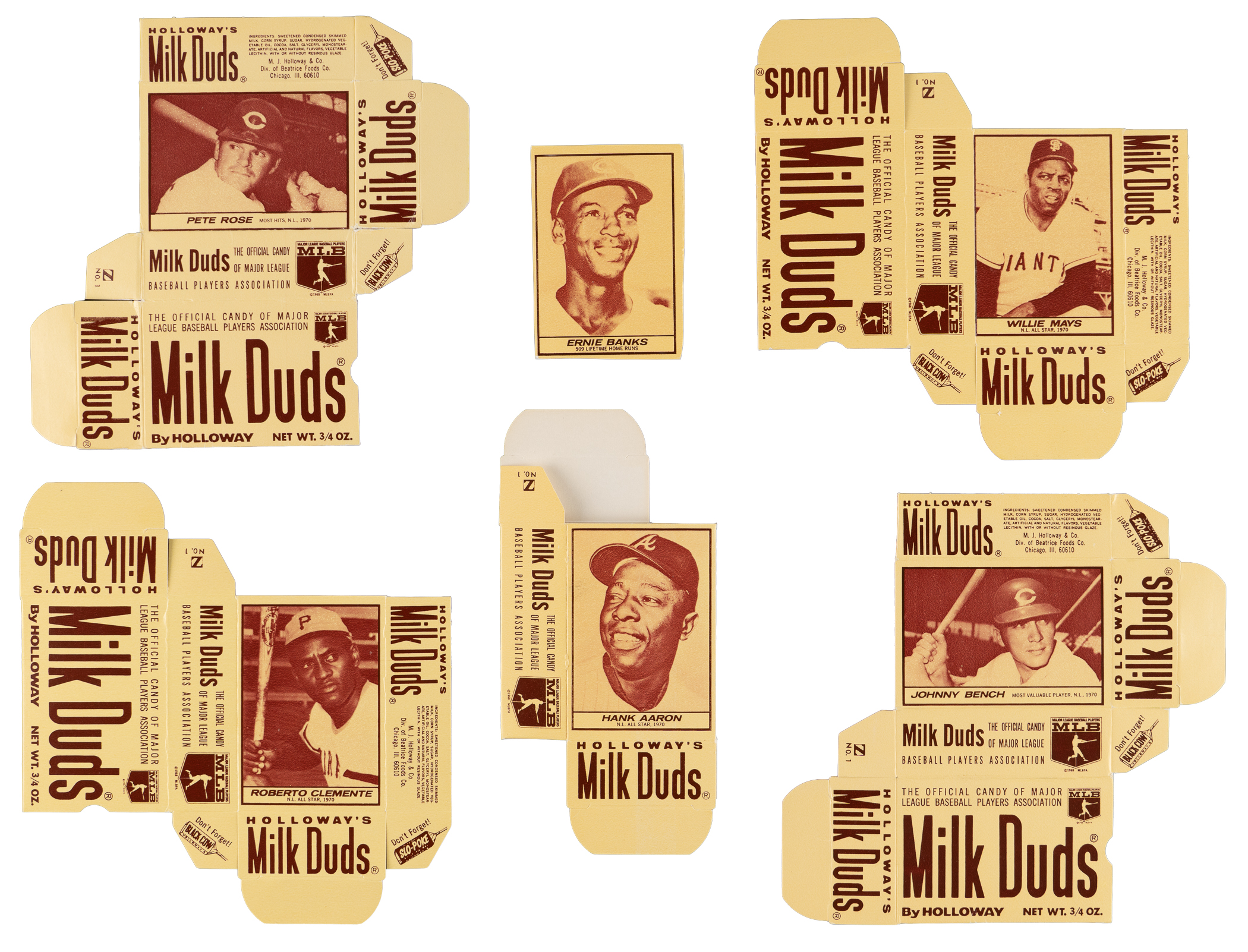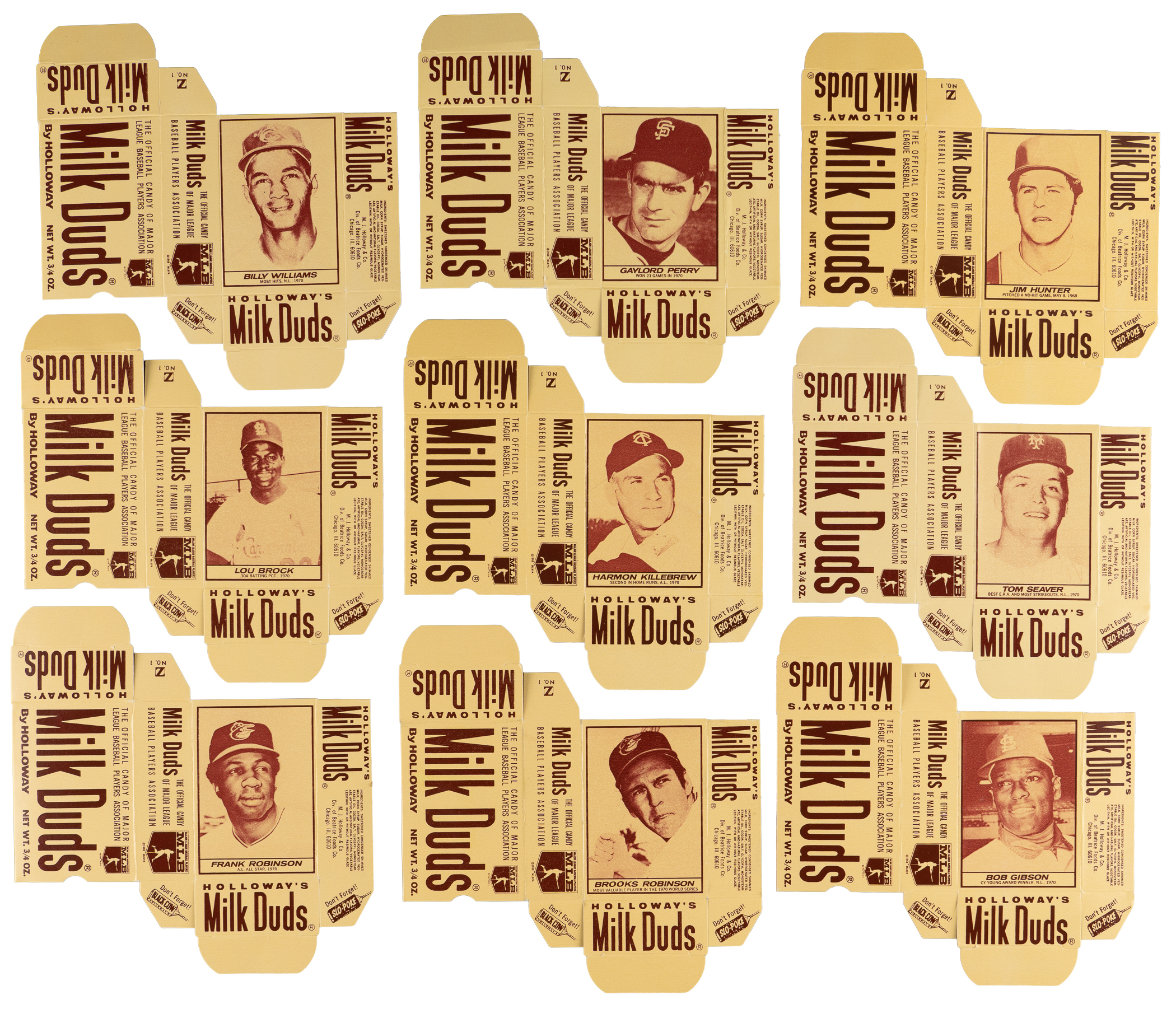 Flattened Complete Boxes: (55 boxes) with #1C Rose (EX-MT), #2A Bench (NM), #3B Mays (NM), #4B Killebrew (NM), #6A Aparicio (VG), #6B Brock (NM-MT), #7B McCovey (NM-MT), #8A Clemente (EX-MT), #9C B. Williams (NM-MT), #10C Perez (EX-MT), #12B Perry (NM), #13C Seaver (VG-EX), #15A Gibson (NM-MT), #16B Hunter (NM-MT), #17B F. Robinson (NM), #18A Cepeda (VG), #18C B. Robinson (NM), #20C Torre (NM-MT), #21A Jenkins (NM), #21B Palmer (VG-EX);