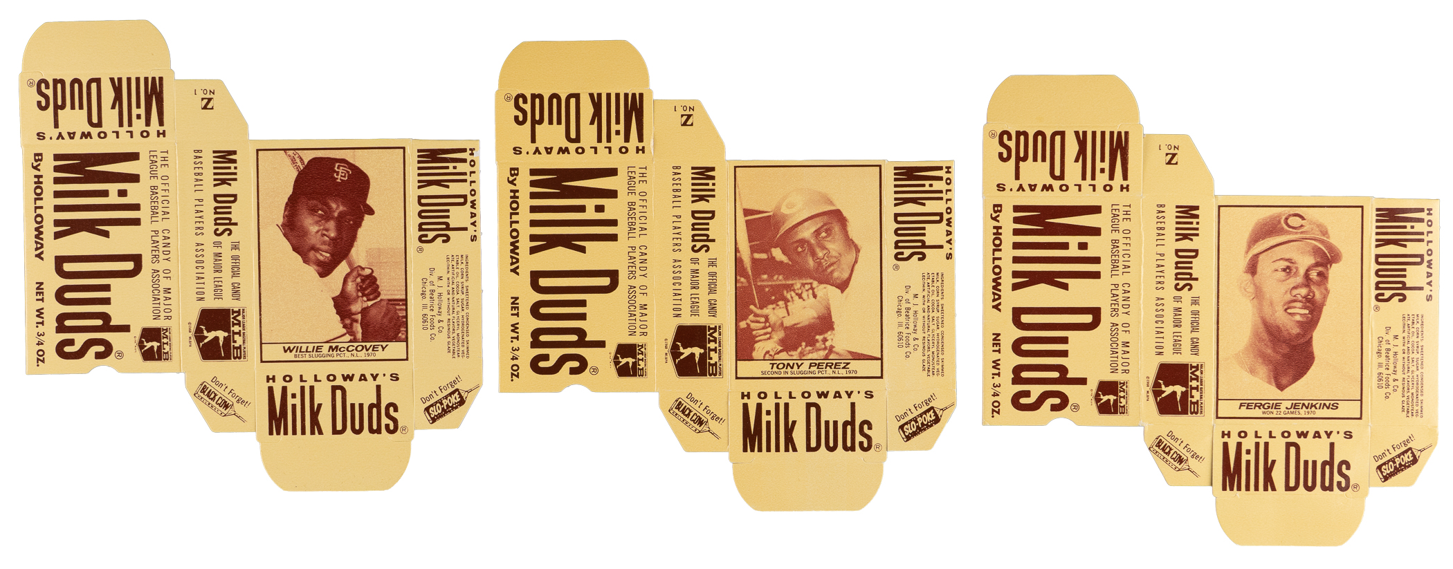Factory Unfolded Boxes: (9 boxes) with #11A Aaron (EX-MT, missing flap), #19A Oliva (NM), #21C Santo (VG-EX);