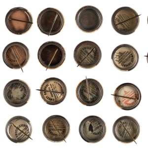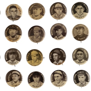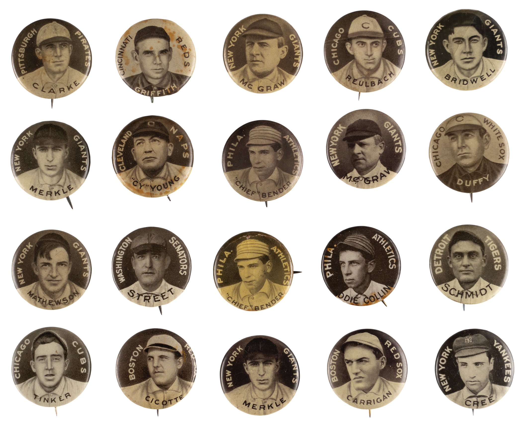 Commons: (60 pins) with Abbaticchio, Ames, Barry, Bates, (2) Becker, Bergen, Bridwell, (2) Byrne, (2) Cicotte (one low-grade), (2) Crandall, Cree, (2) Delahanty, (3) Devlin, (2) Devore, Dougherty, Drucke, Evans, Ferguson, (2) Flynn, Fromme, Gaspar, Gray, (2) Groom, Hemphill, Krause, Latham, McIntire, (2) Merkle, (2) Meyers, Miller, Moran, Parent, Pfiester, Quinn, Reulbach, Schaefer, Schulte, Sheckard, H. Smith, Stanage, Warhop, White, (2) O. Wilson, (2) Wiltse, Wolter;