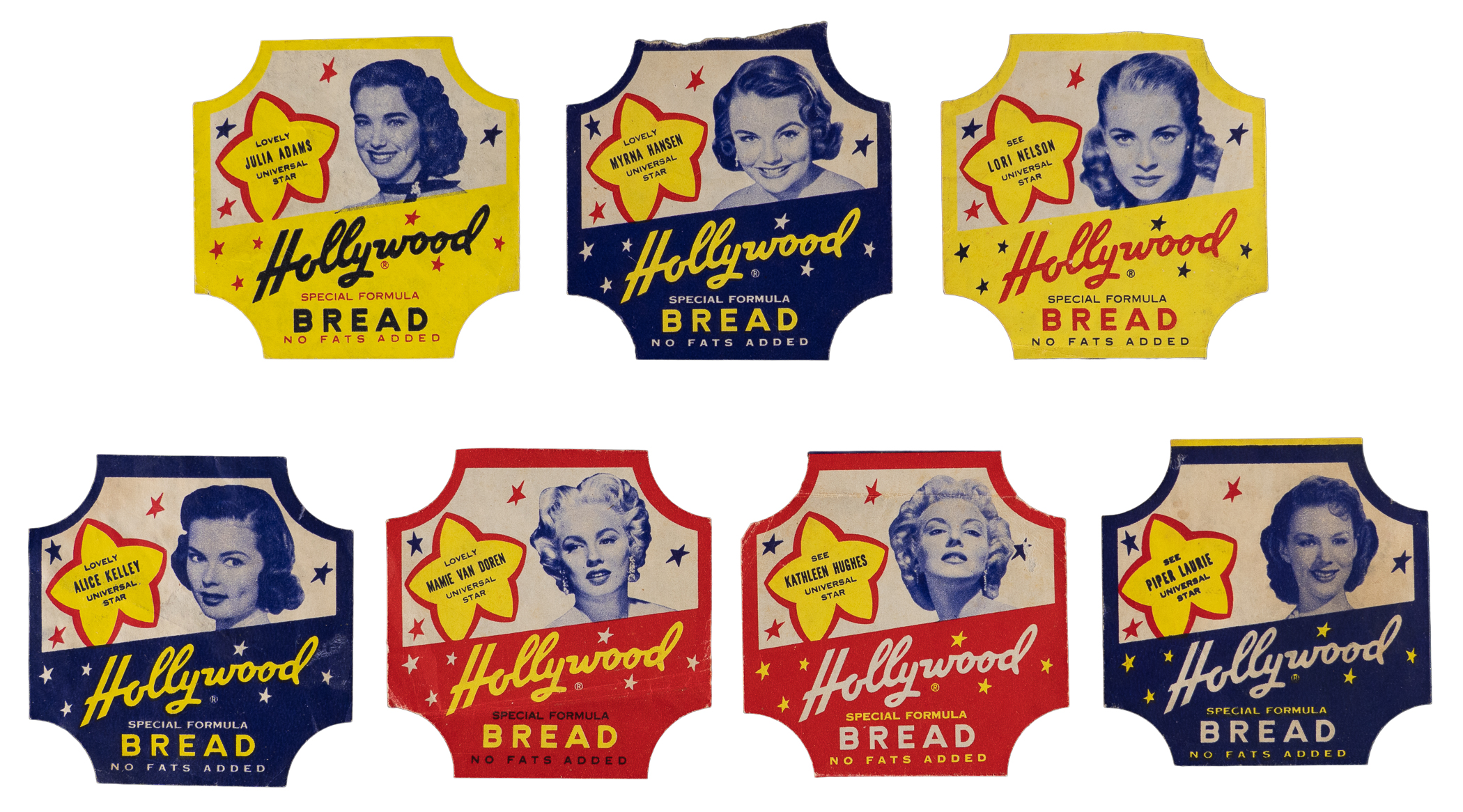 A galaxy of starlets provides class and beauty to these seven 1950s Hollywood Movie Stars bread labels. Few examples of these sirens have surfaced for public sale. These actresses emerge from a starburst die-cut design with vibrant advertising text. The surfaces are relatively clean with instances of mild creasing, edge fraying, and limited reverse packaging residue. Includes: Julia Adams, Myrna Hansen (missing upper edge), Kathleen Hughes (creased), Alice Kelley, Piper Laurie, Lori Nelson and Mamie Van Doren.