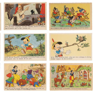 The global appeal of Disney is evident with the offered pair of 1938 and 1945 Snow White and Pinocchio Postcard complete sets. These French text correspondence pieces are unused and generally present in the (EX-MT to NM) range with some better or lesser. Includes: 1.) 1938 Snow White Postcards set (24) and 2.) 1945 E. Sepheriades Pinnocchio Postcards set (25) with original wrapper.