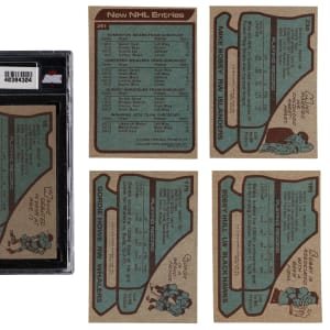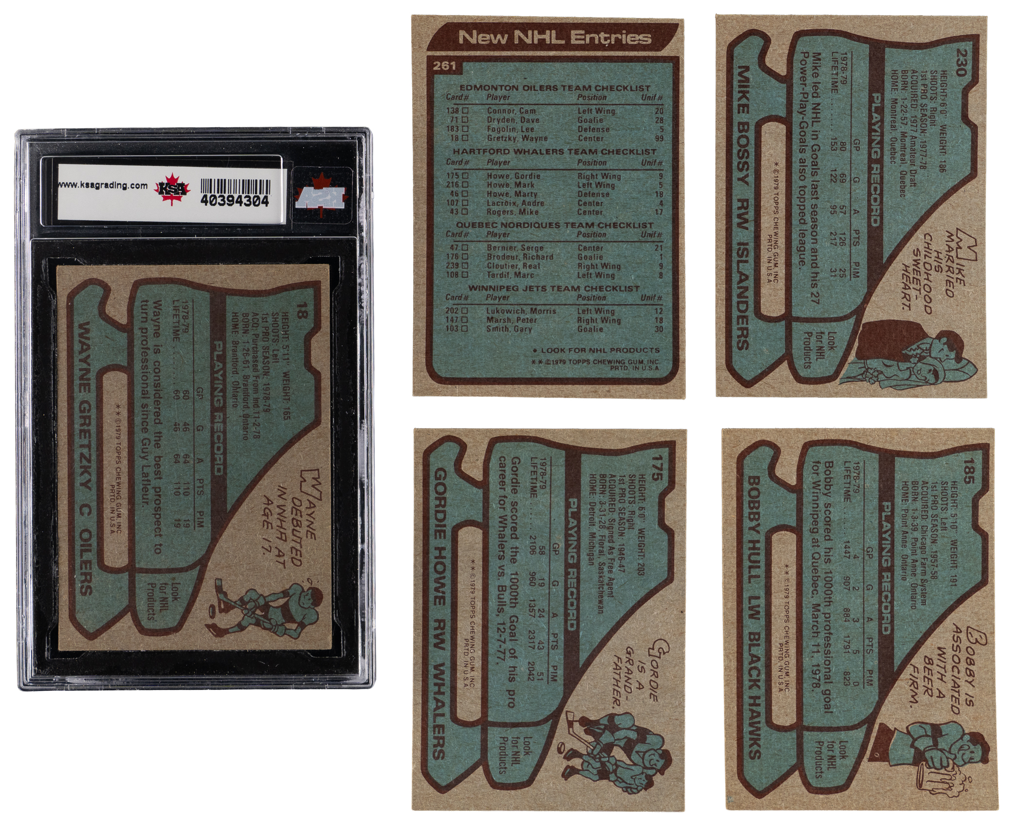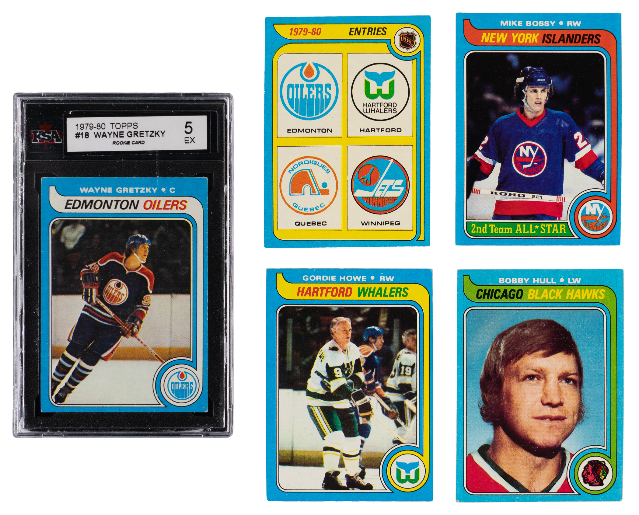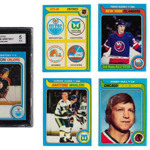 Face off for the offered 1979-1980 Topps Hockey complete set of (264) cards. This blue-bordered series generally averages (EX-MT) condition with some better or lesser. The lower end of the condition spectrum is primarily due to factory errant centering common to the issue. Highlights include: #18 Gretzky RC (KSA EX 5), #175 Howe (VG-EX), #185 Bo. Hull (EX), #230 Bossy (EX-MT) and #261 New Entries CL (EX-MT).