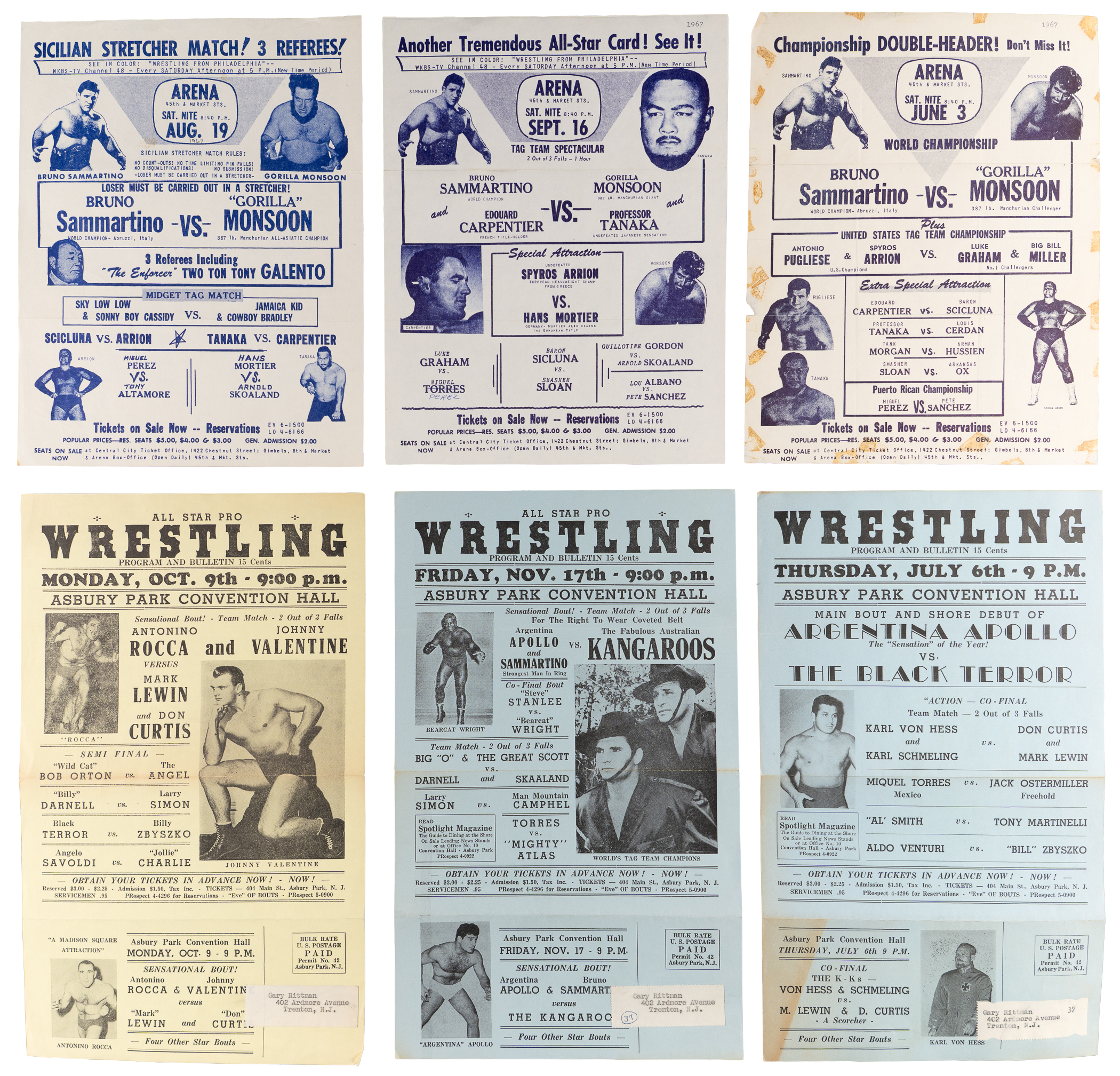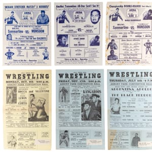 Wrasslin' slobber knockers contend for the title with these (20) 1961-1967 handbill posters. These advertising pieces for regional "house shows" generally survive in the 8-1/2 x 14" range with a percentage lesser. Despite varying degrees of tape residue, mailing tabs, written notations, and evidence of fold stress dispersed throughout, these turnbuckle terrors are still quite attractive and very presentable. Legends including Argentina Rocca, Bobo Brazil, Gorilla Monsoon, Lou Albano, Bob Orton, Buddy Rogers and Bruno Sammartino take top billing in this punishing assortment!