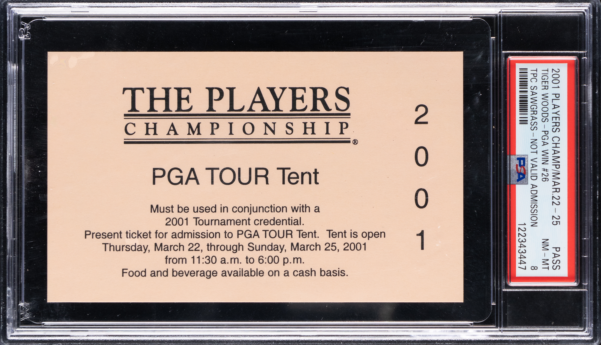2001 Players Championship Pass PSA NM-MT 8 - Tiger Woods PGA Win #26, event famously highlighted by his iconic "Better than Most" putt, edging Vijay Singh by one stroke (This is the ONLY example that PSA has examined).