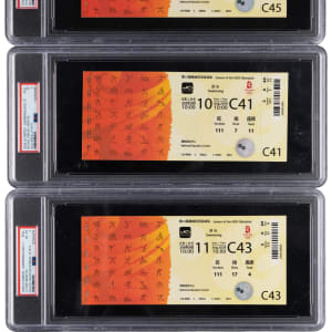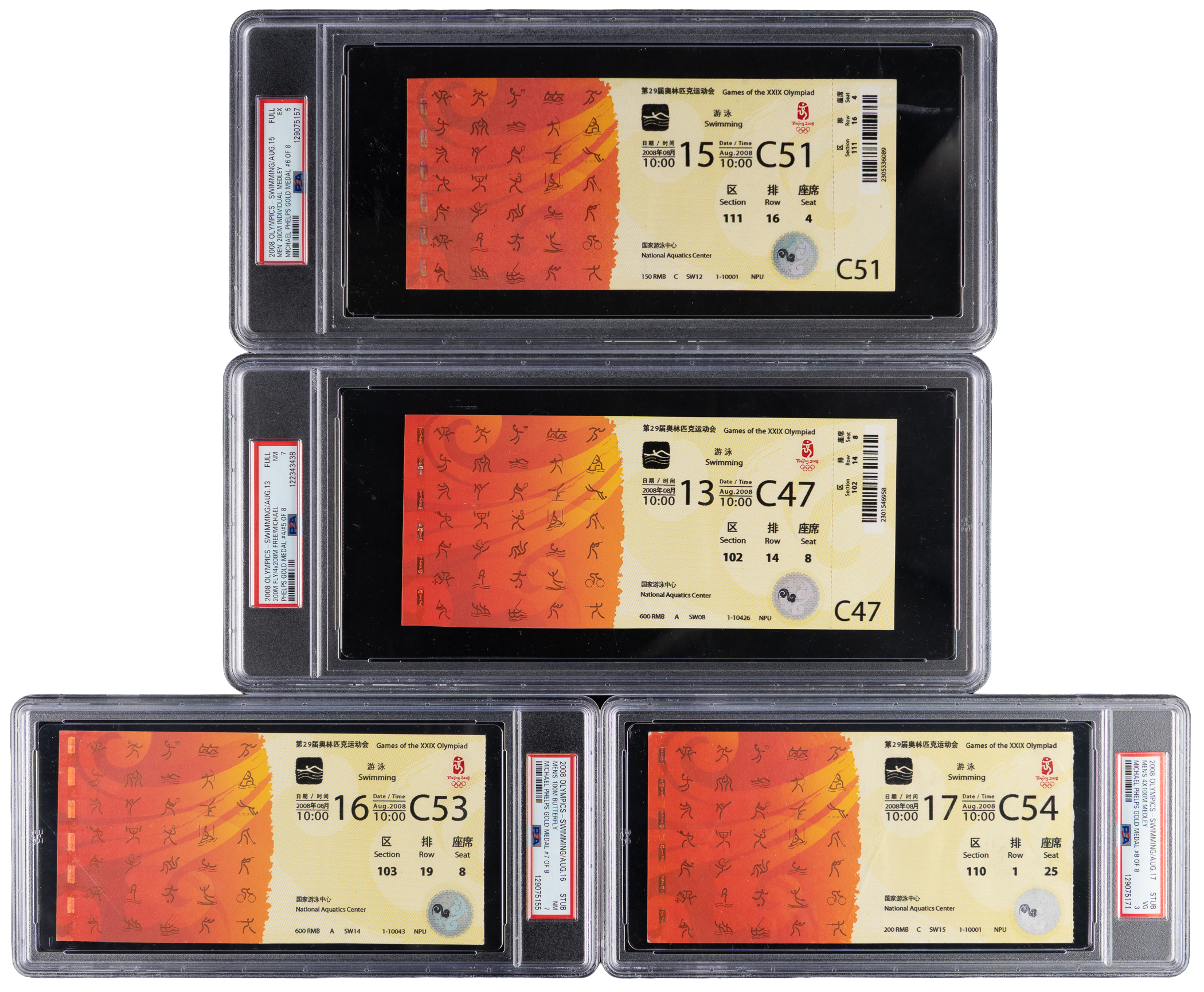 A clean sweep! Besting his 2004 Athens Olympiad, Michael Phelps would win a gold in all eight events that he competed in during the 2008 Beijing Olympics. Offered is a complete set of tickets from these golden moments. While there are two ticket stubs in the set, the remaining examples are full tickets, all of which have been encapsulated by PSA. Included in this tremendous offering are: