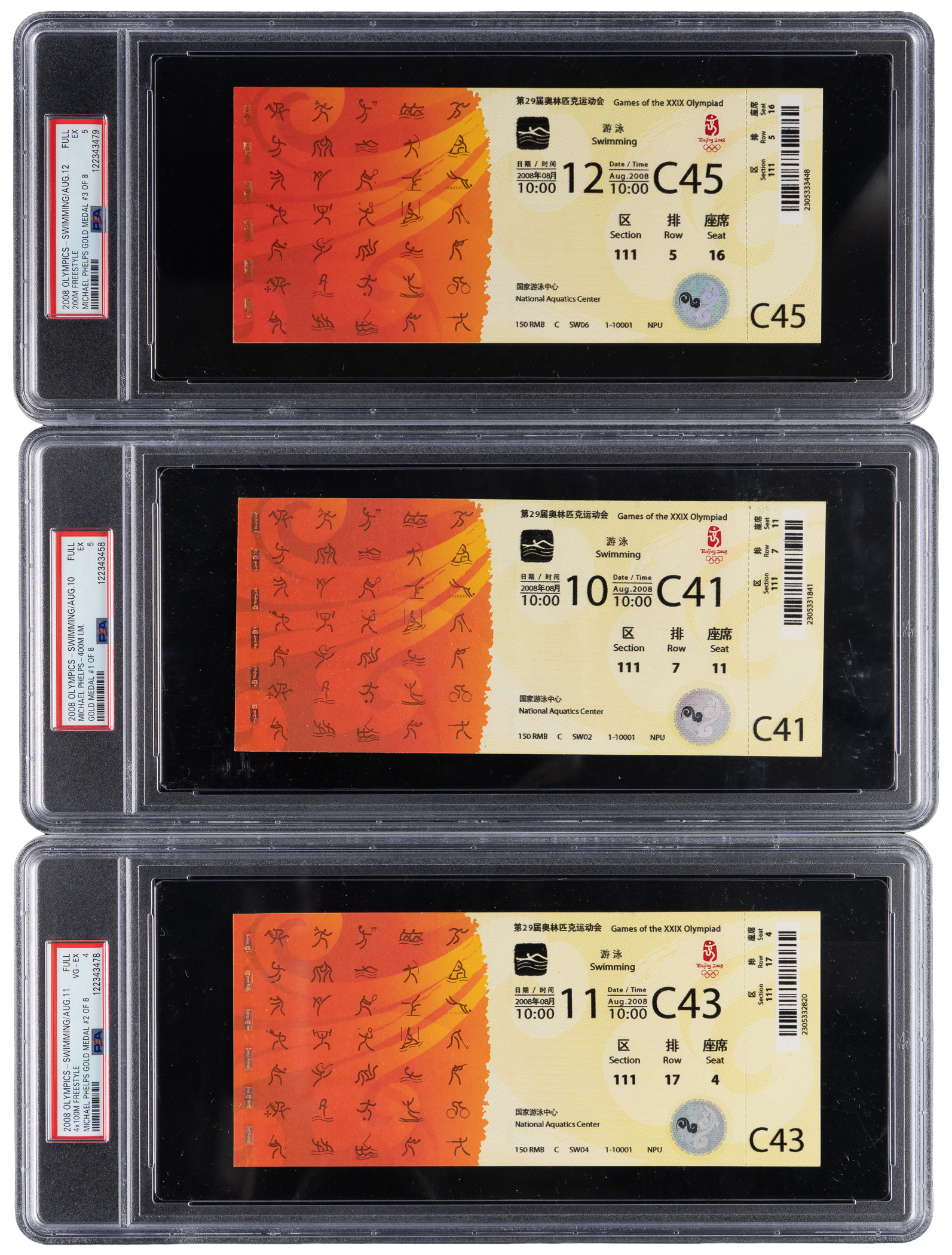 August 13 - Gold Medal #4/#5, 200M Butterfly / 4x200M Freestyle Full Ticket PSA NM 7 (Population 3, only 2 higher)