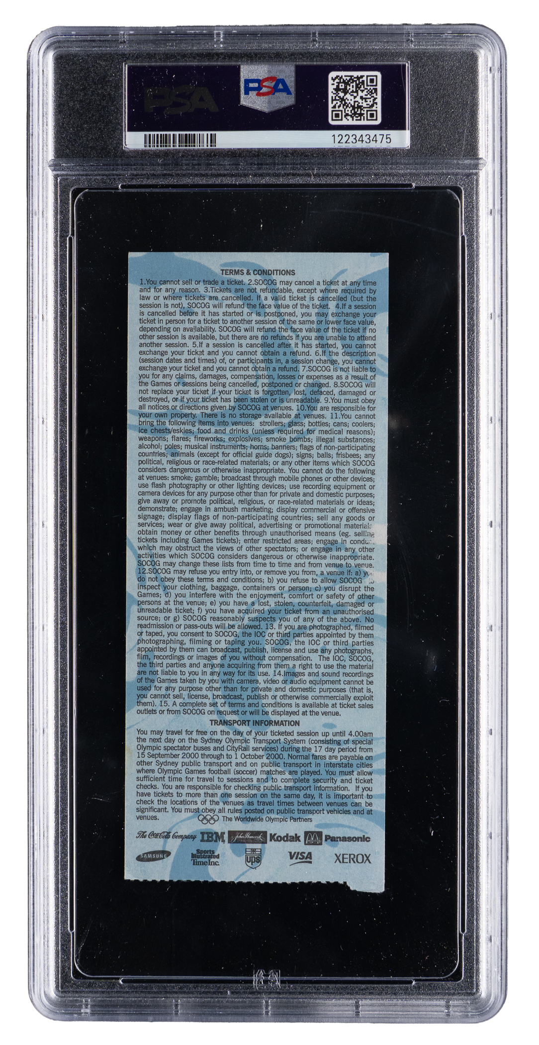Graded EX-MT 6 by PSA. At the ripe age of 15, Michael Phelps had impressed to the point of becoming the youngest male since 1932 to make a U.S. Olympic swim team. Graciously, he would allow three other Olympians to medal, finishing fifth, before his binge of compiling twenty-eight Olympic medals between the 2004 to 2016 editions. Presented is an original ticket stub from his Olympic debut, the 200M Butterfly qualifying heat, dated to September, 18, 2000 in Sydney. The PSA population report classifies this relic as the sole finest of only three examples that PSA has examined (Population 1, with none better).