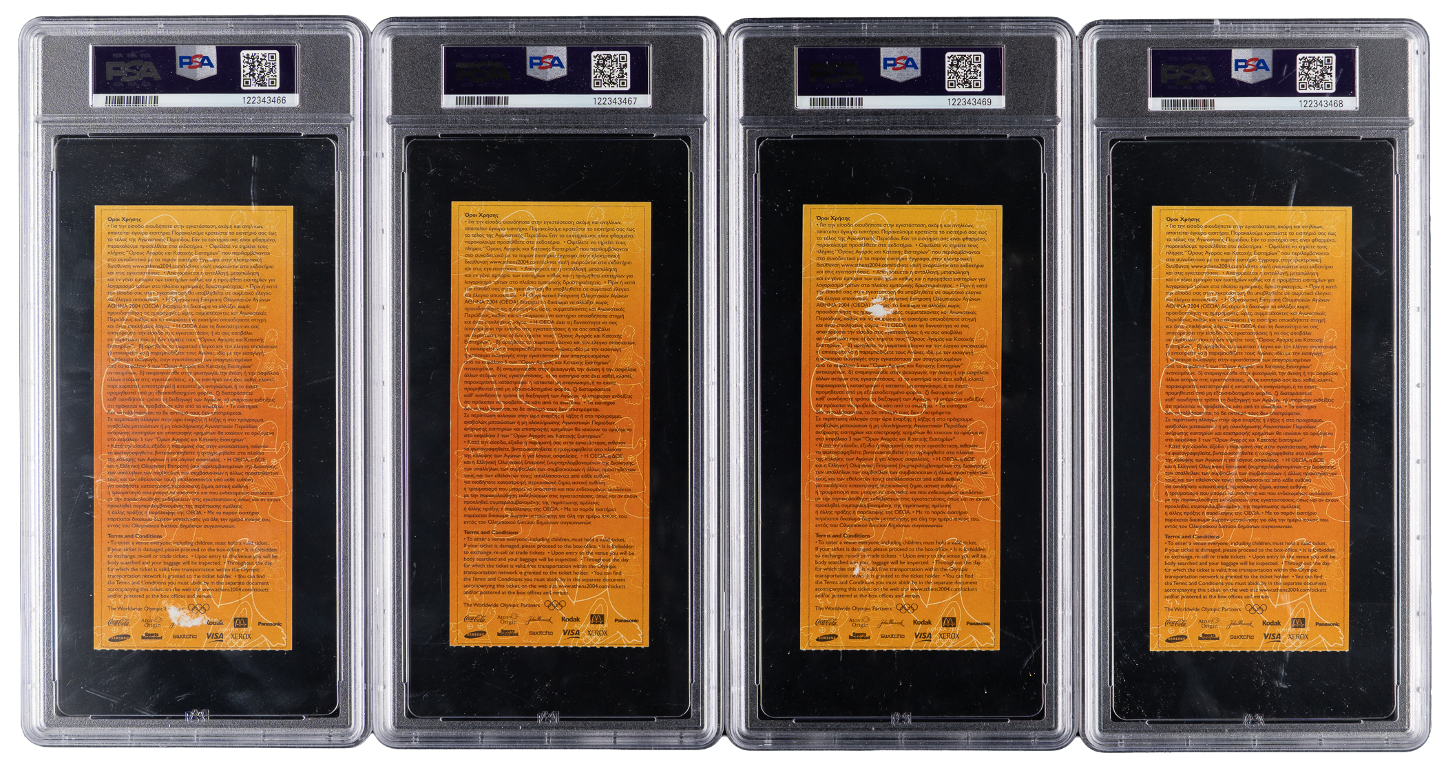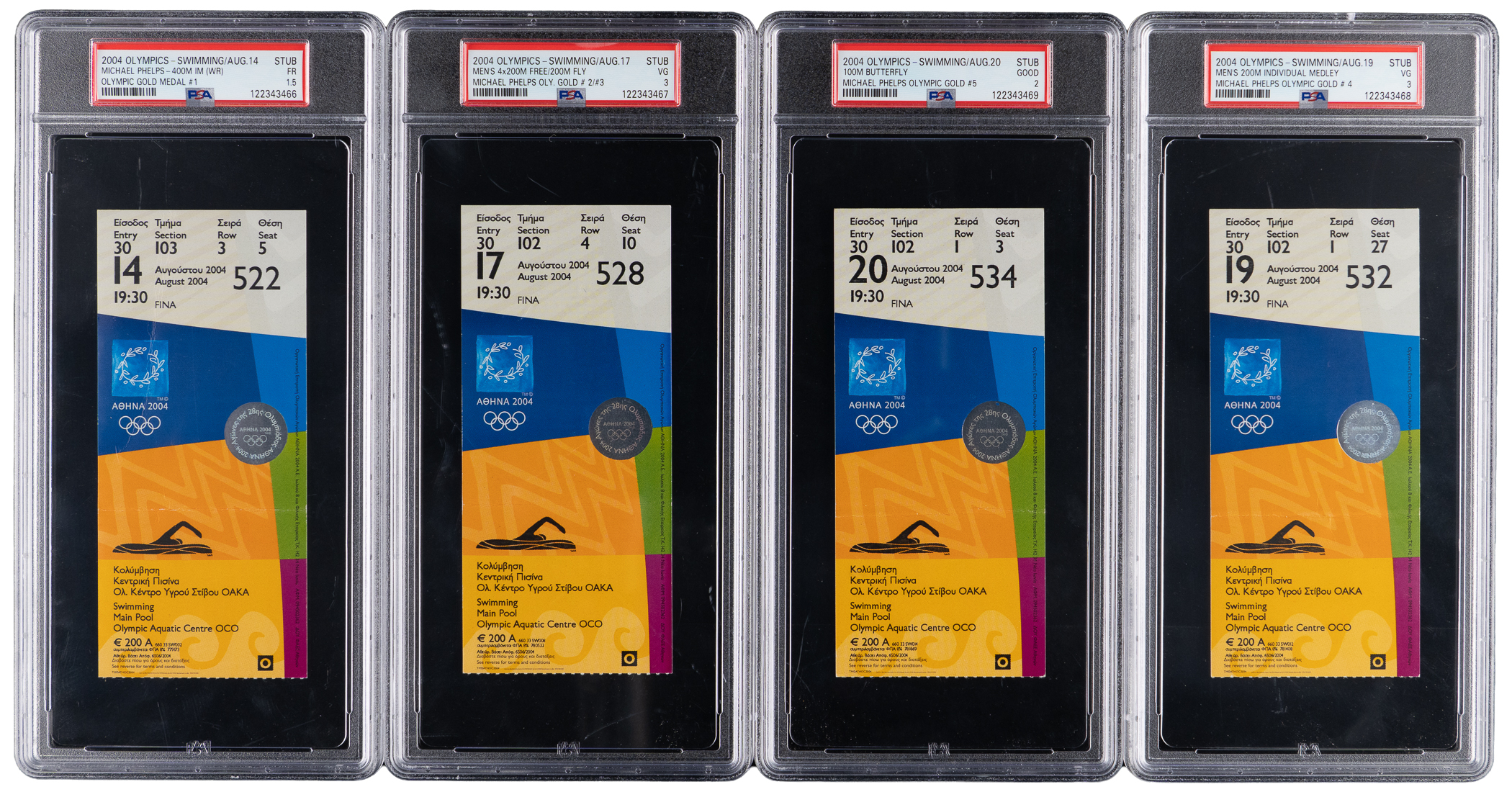 The Baltimore Bullet, Michael Phelps, holds the distinction of being the most decorated Olympian. Among the 28 total medals in his cabinet, a whopping 23 of them are of the gold variety (both records). The offered lot contains significant ticket stubs from his first Olympiad, the 2004 games in Athens. During these events he would win his first six gold medals, five of which are represented in this PSA graded grouping. Included are: