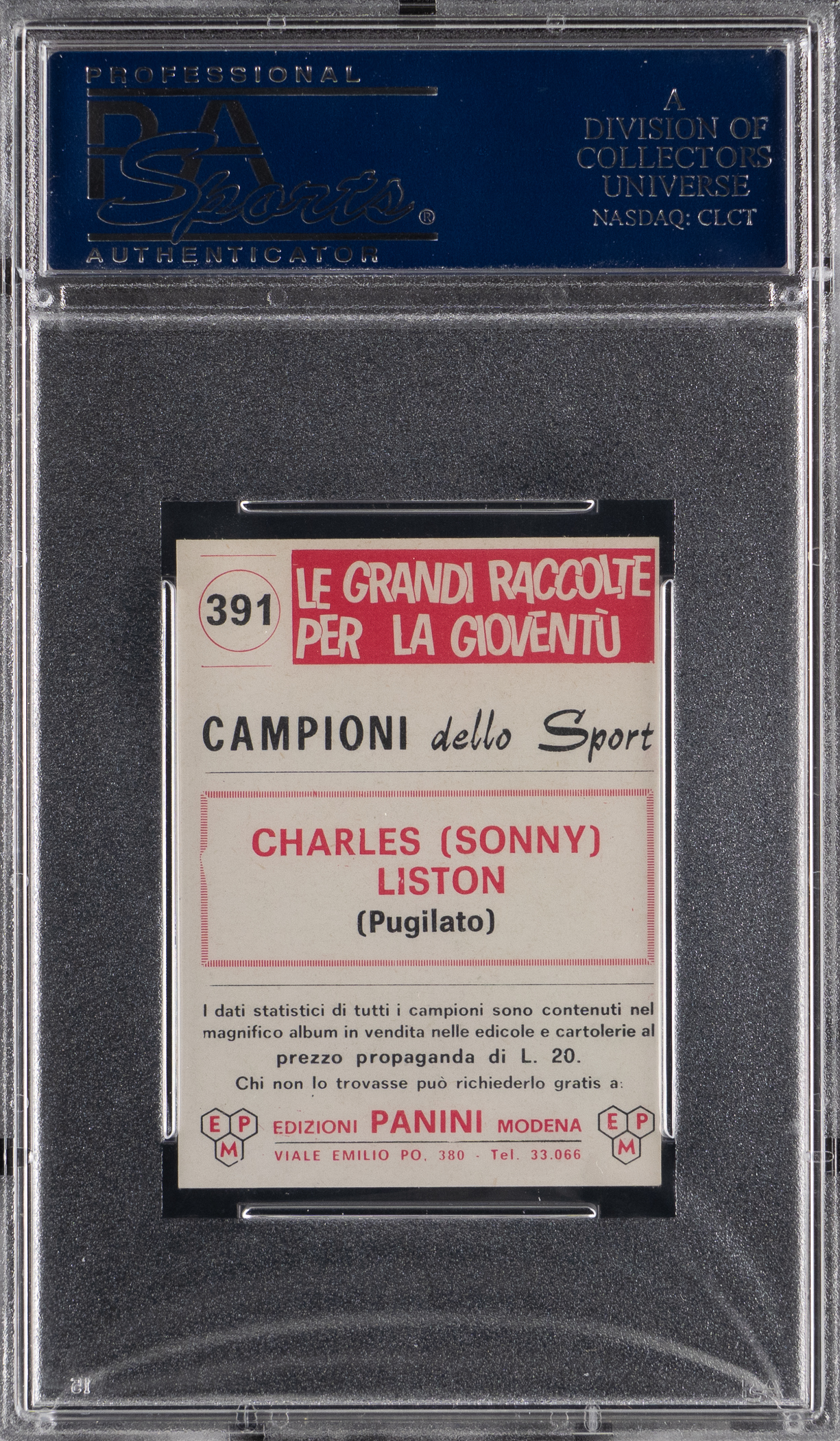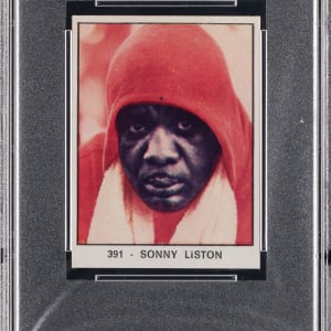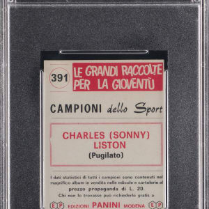 Graded NM-MT 8 by PSA. "The Big Bear" casts an intimidating scowl on the offered 1966 Panini Campioni Dello Sport #391 Sonny Liston rookie card. Better known as the felled opponent of Cassius Clay/Muhammad Ali, the Arkansas-born Heavyweight dominated the ranks with a 50-4 career record. This Italian release presents high-grade with strong corners, creamy edges, and scorching surface colors.