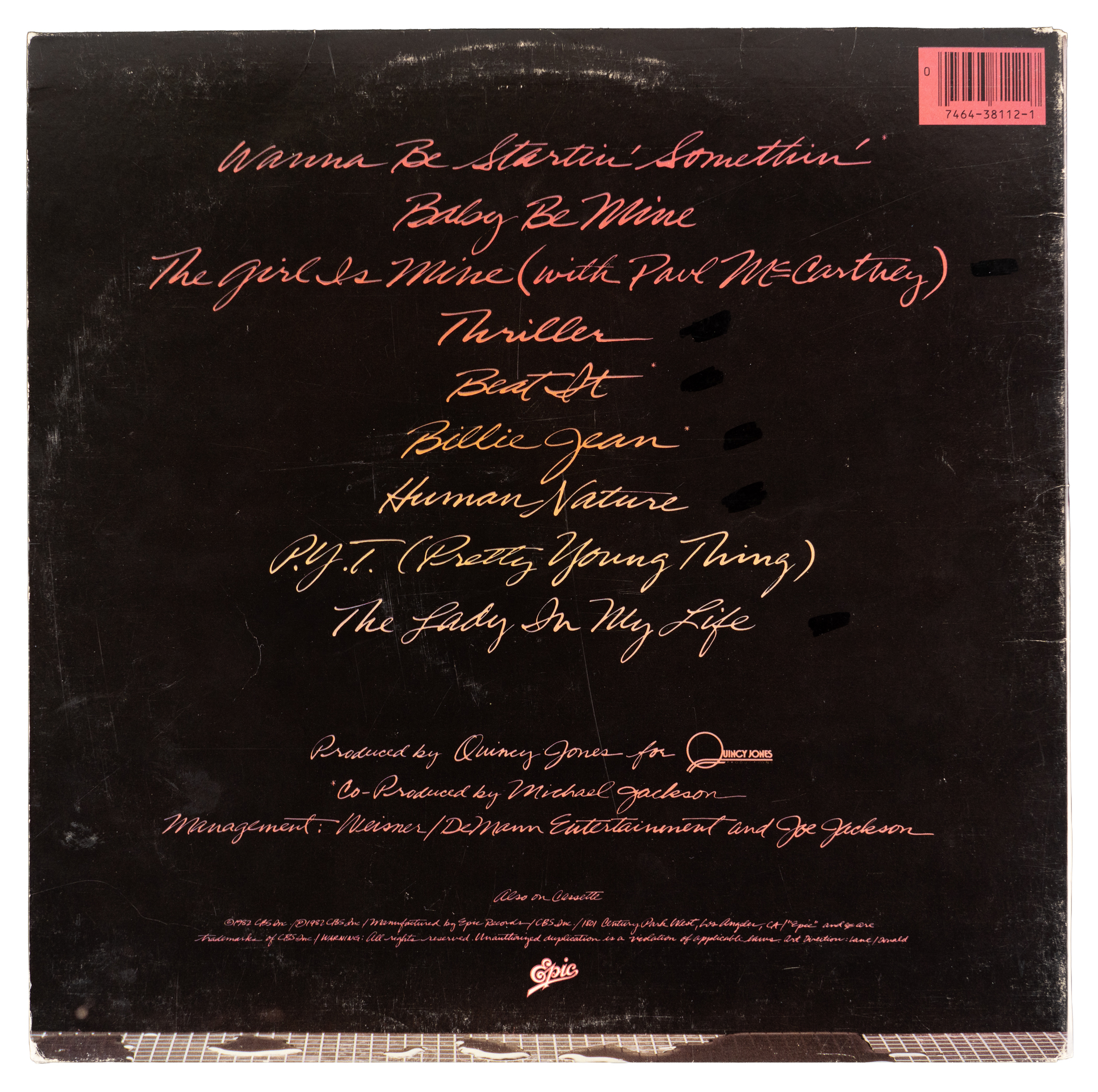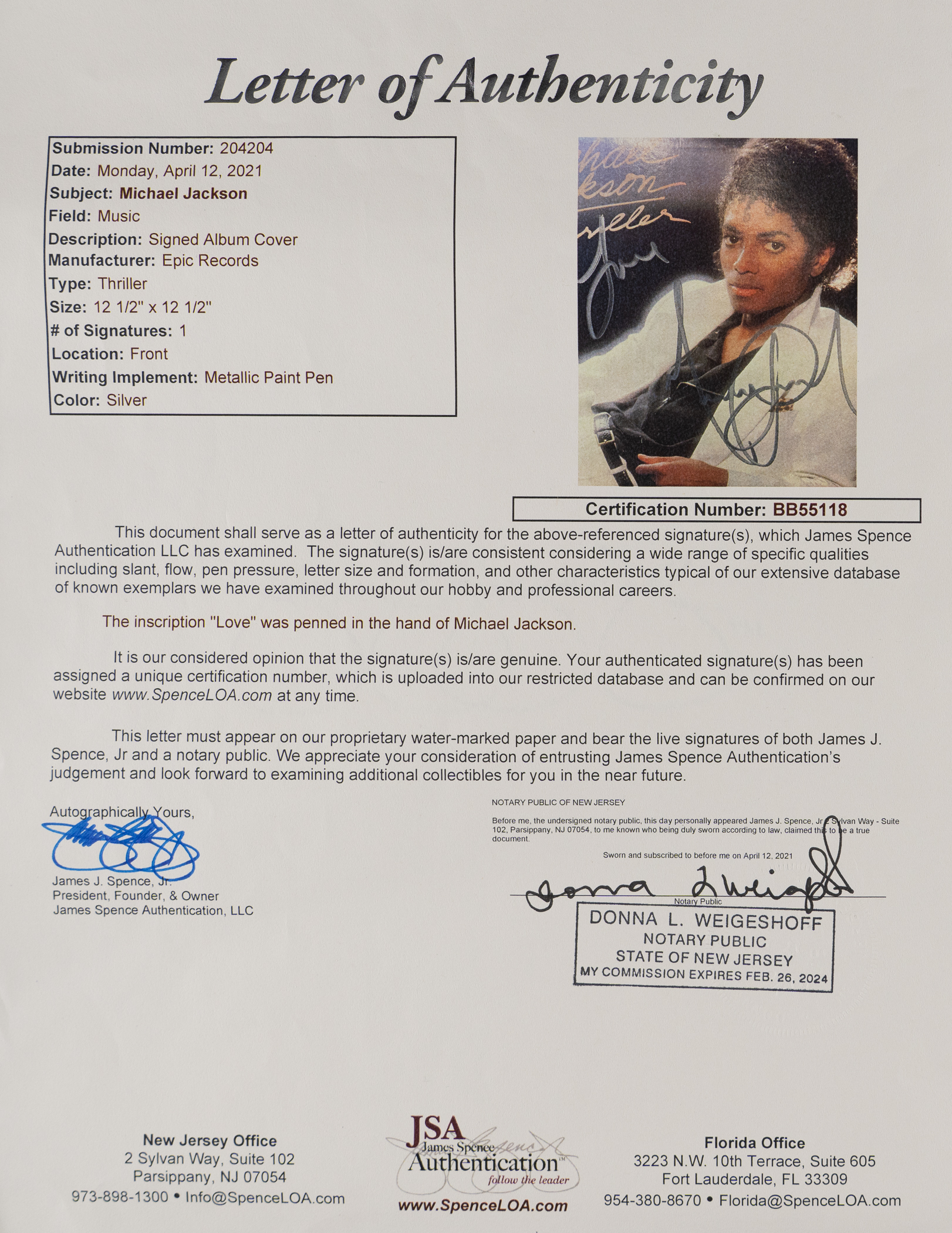 Incredible Eye Appeal! The defining work of Motown and Epic records legend Michael Jackson, "Thriller" cemented the Indiana-born artist's status as pop's biggest icon, selling a record 110 million copies (and counting) and warranting a record eight Grammy Awards at the 1984 ceremonies. Presented is an signed album cover of the landmark title. This captivating example presents beautifully, with Jackson's exceptionally bold silver Sharpie autograph and "Love" salutation spanning nearly 10" against the stark black-and-white background. The Epic QE 38112 U.S. first press gatefold jacket (no record included) presents a strong VG with only mild perimeter creasing. We'll leave it to the winning bidder to supply the vinyl. Full LOA from James Spence/JSA.