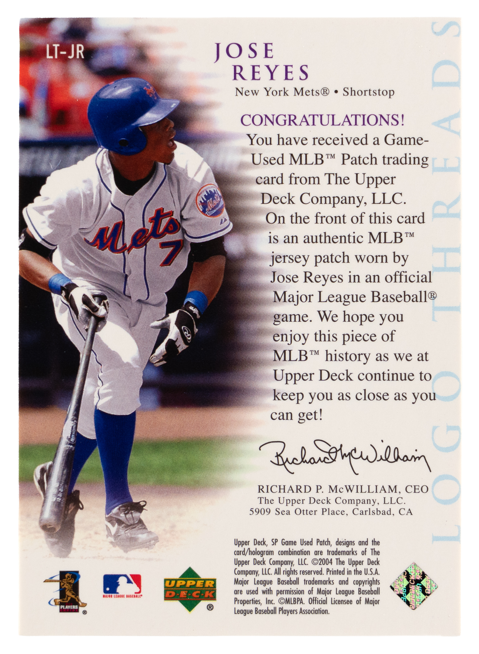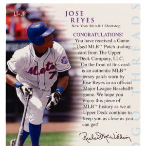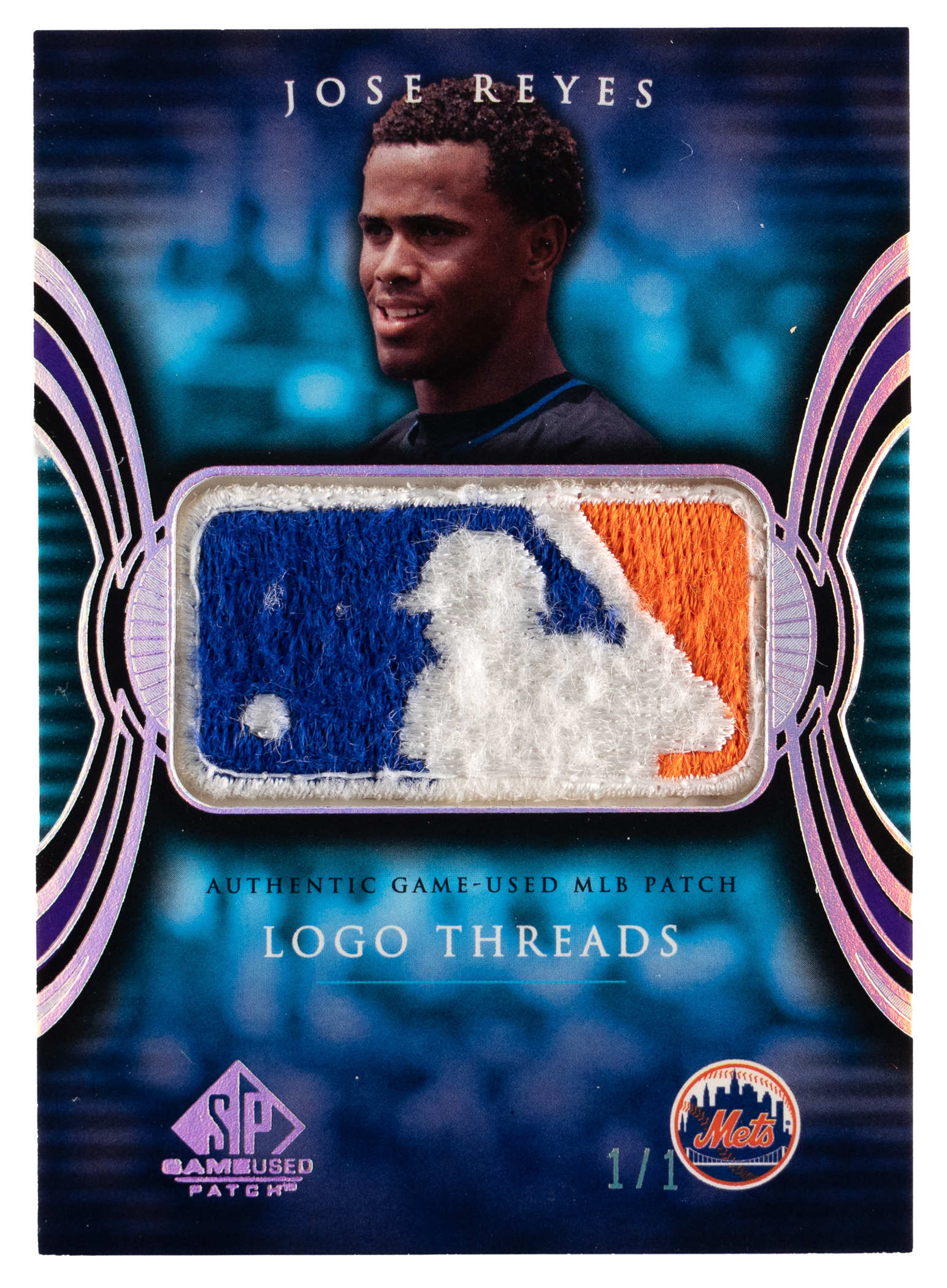 Serially numbered #1/1. A logoman patch of four-time New York Mets All-Star Jose Reyes. Logo Threads subset.