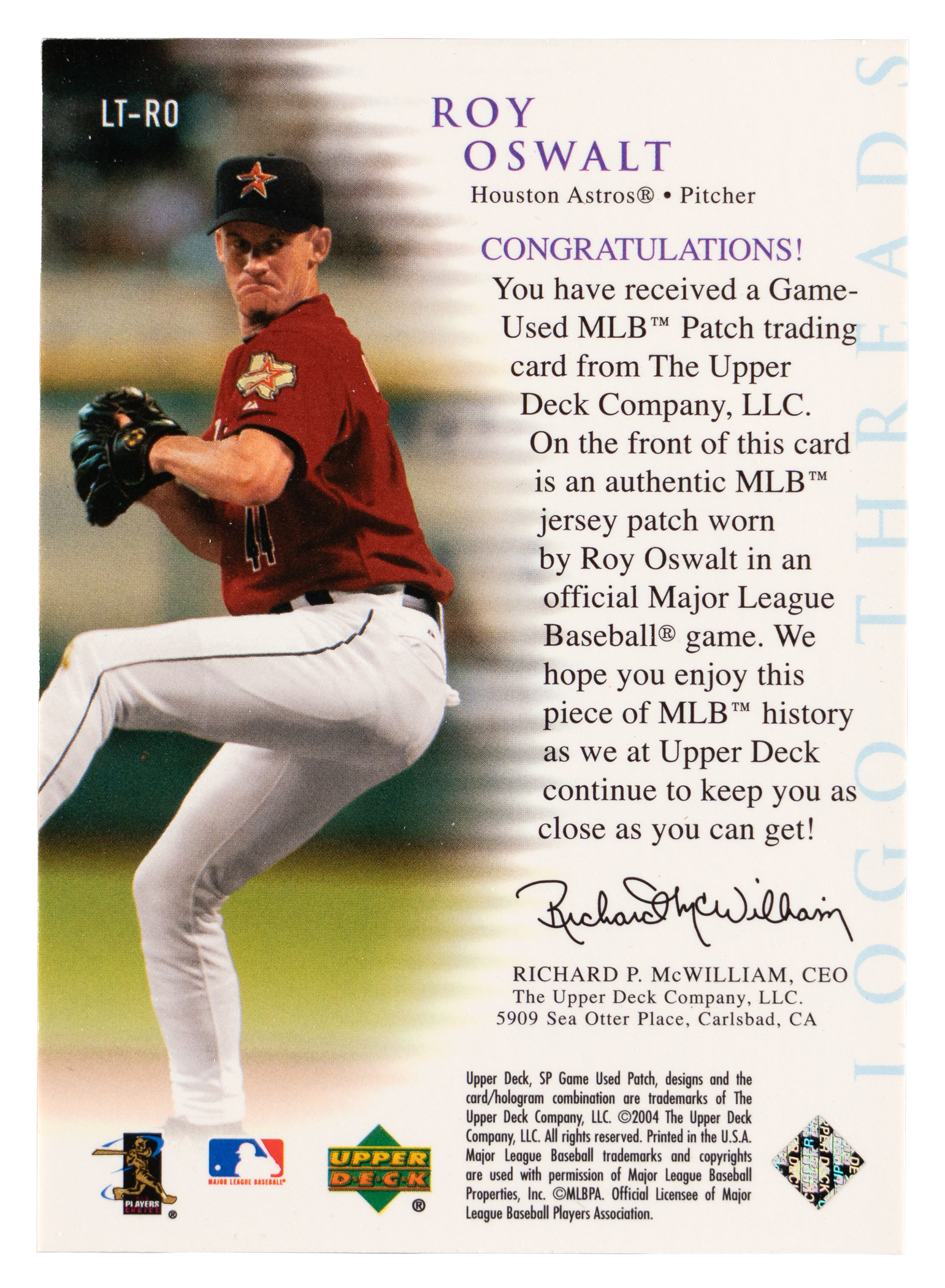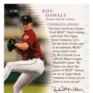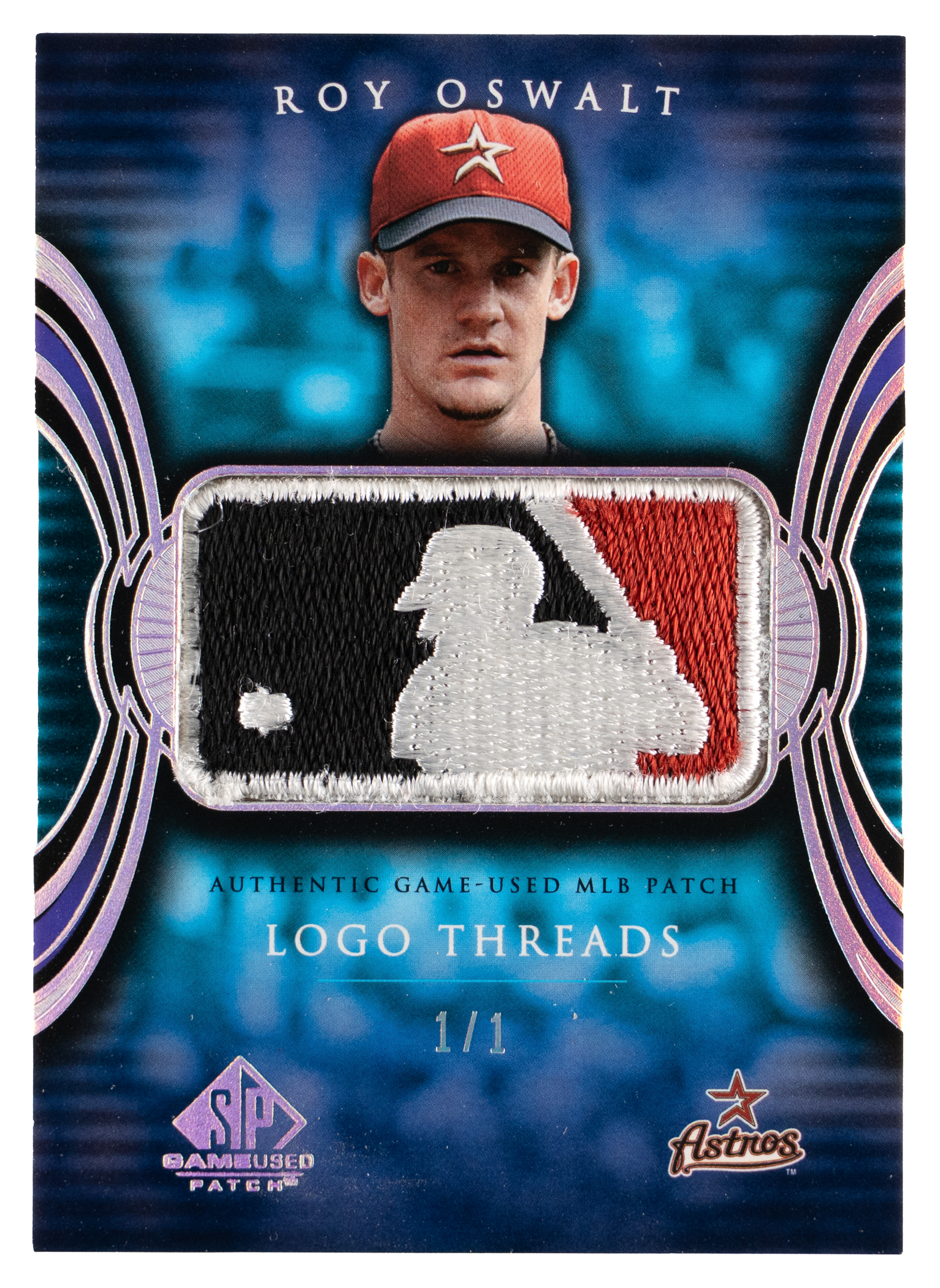 Serially numbered #1/1. A logoman patch of three-time Houston Astros All-Star Roy Oswalt. Logo Threads insert set.